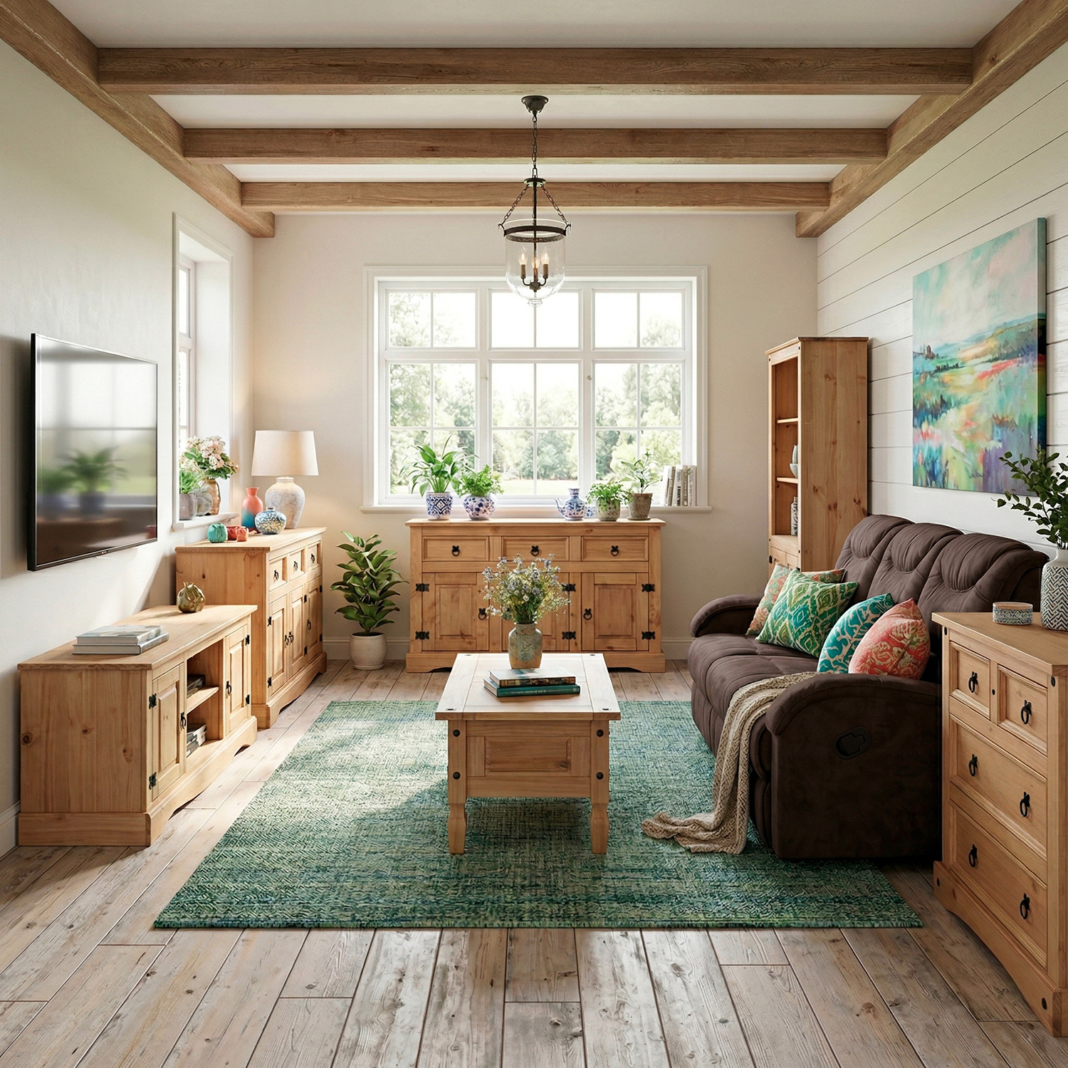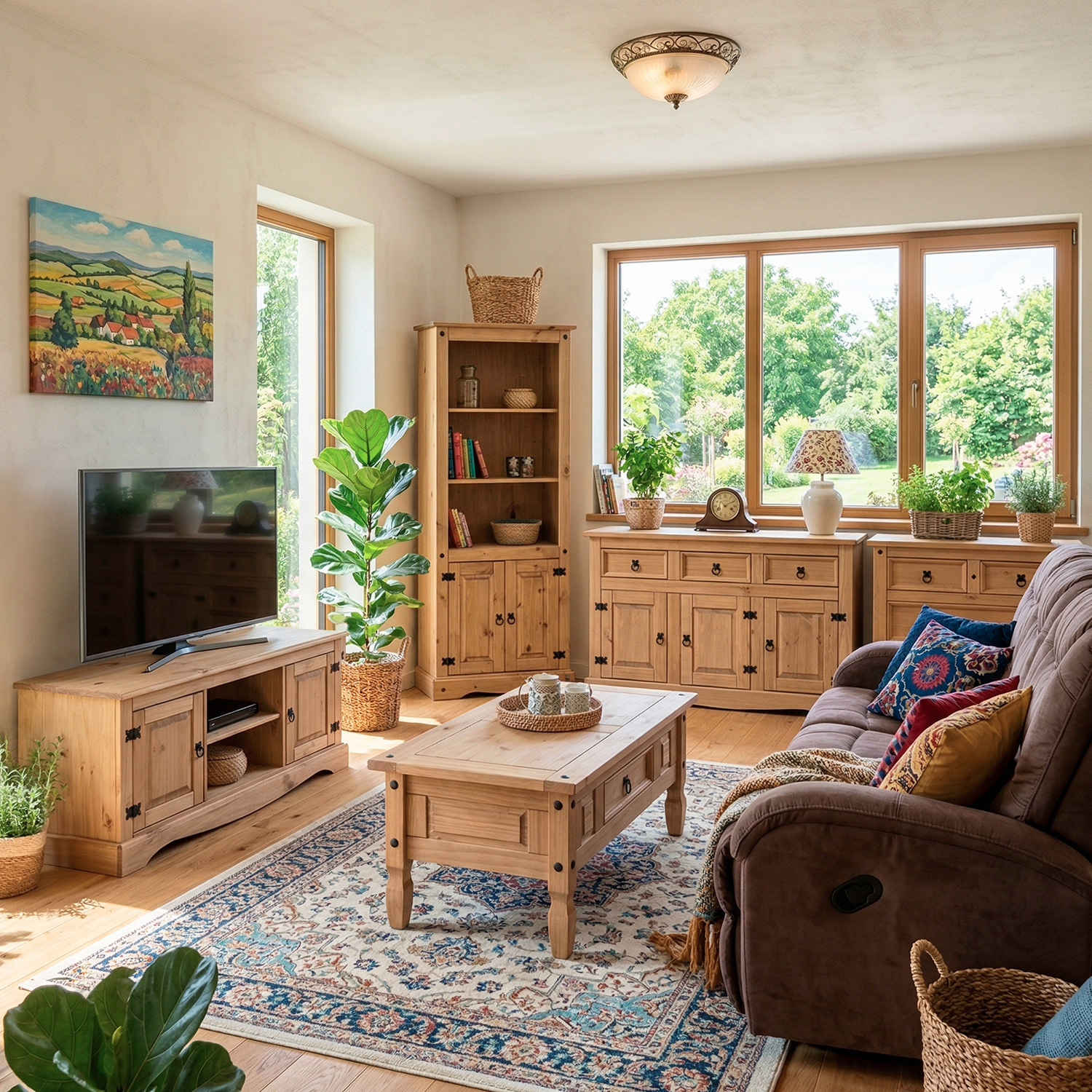 materiál masiv borovice voskovaná v medovém odstínu 2 malé zásuvky, 1 police, kovové ozdobné úchytky součást sestavy Corona