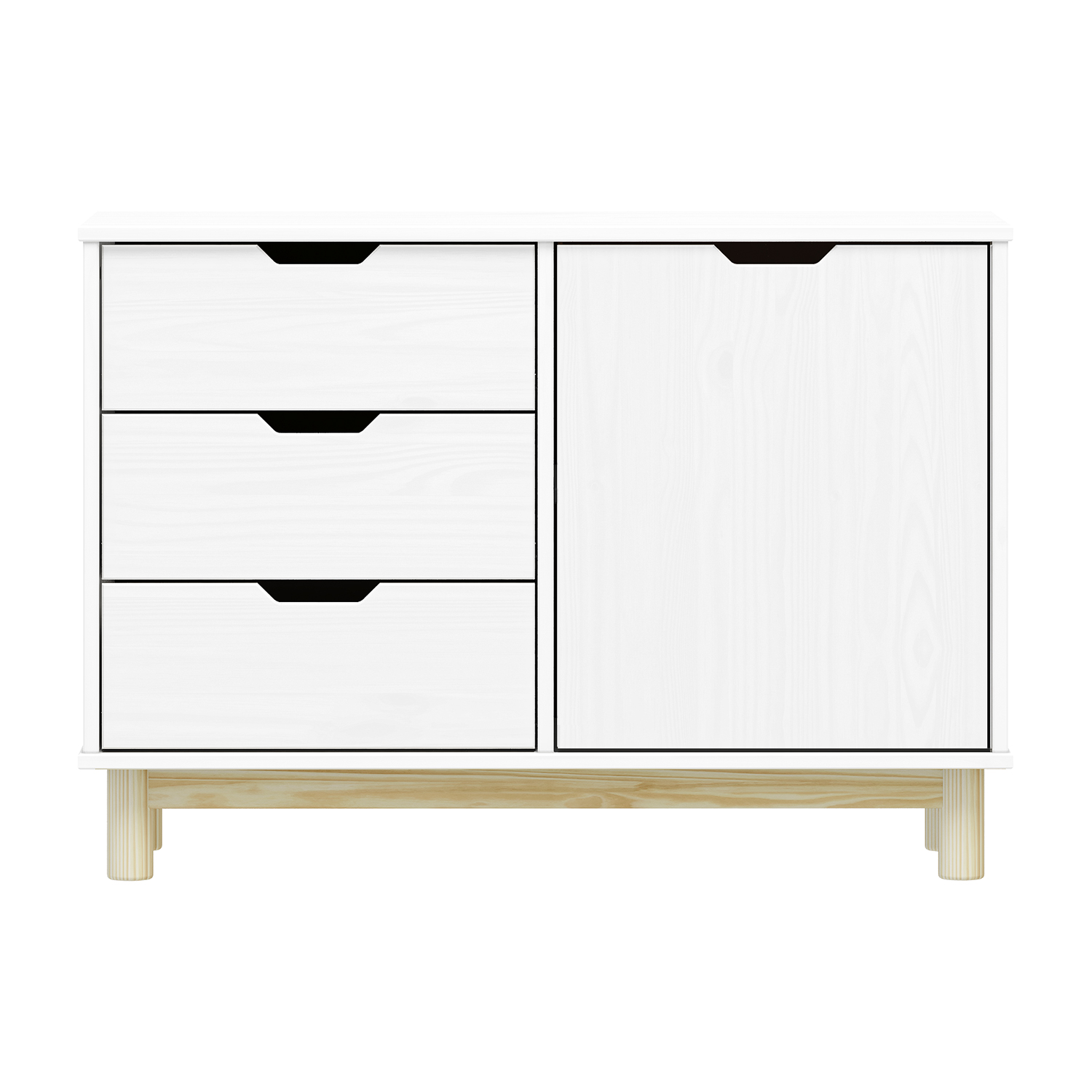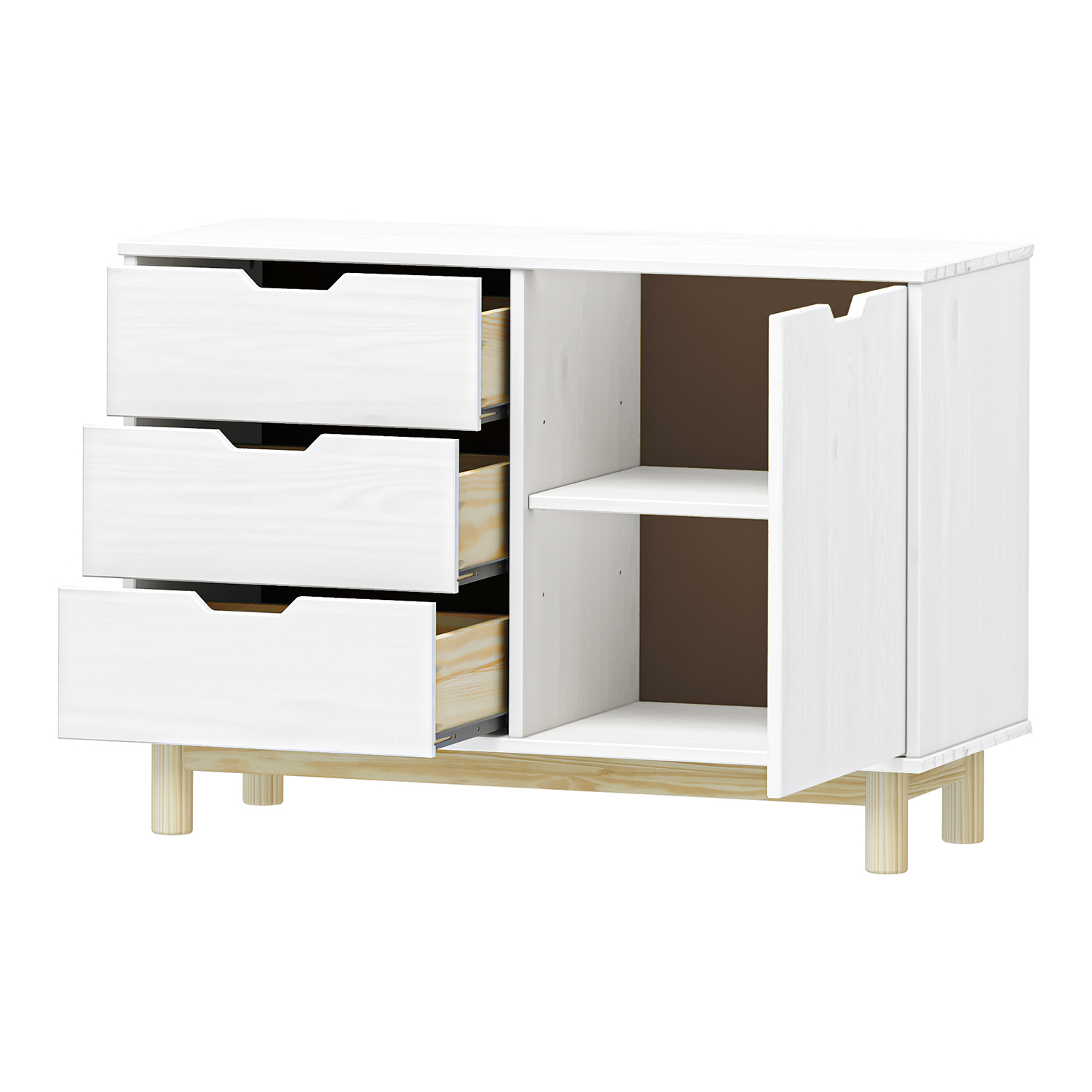 materiál masiv borovice, barevné provedení bílý lak 2 zásuvky s kovovými pojezdy, 1 dvířka, 1 police otvor na protažení kabelů
