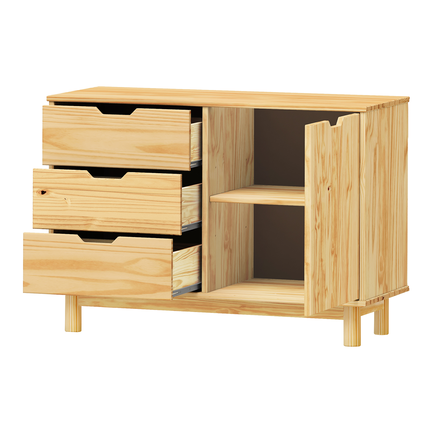 3 zásuvky s kovovými pojezdy, 1 dvířka, 1 police