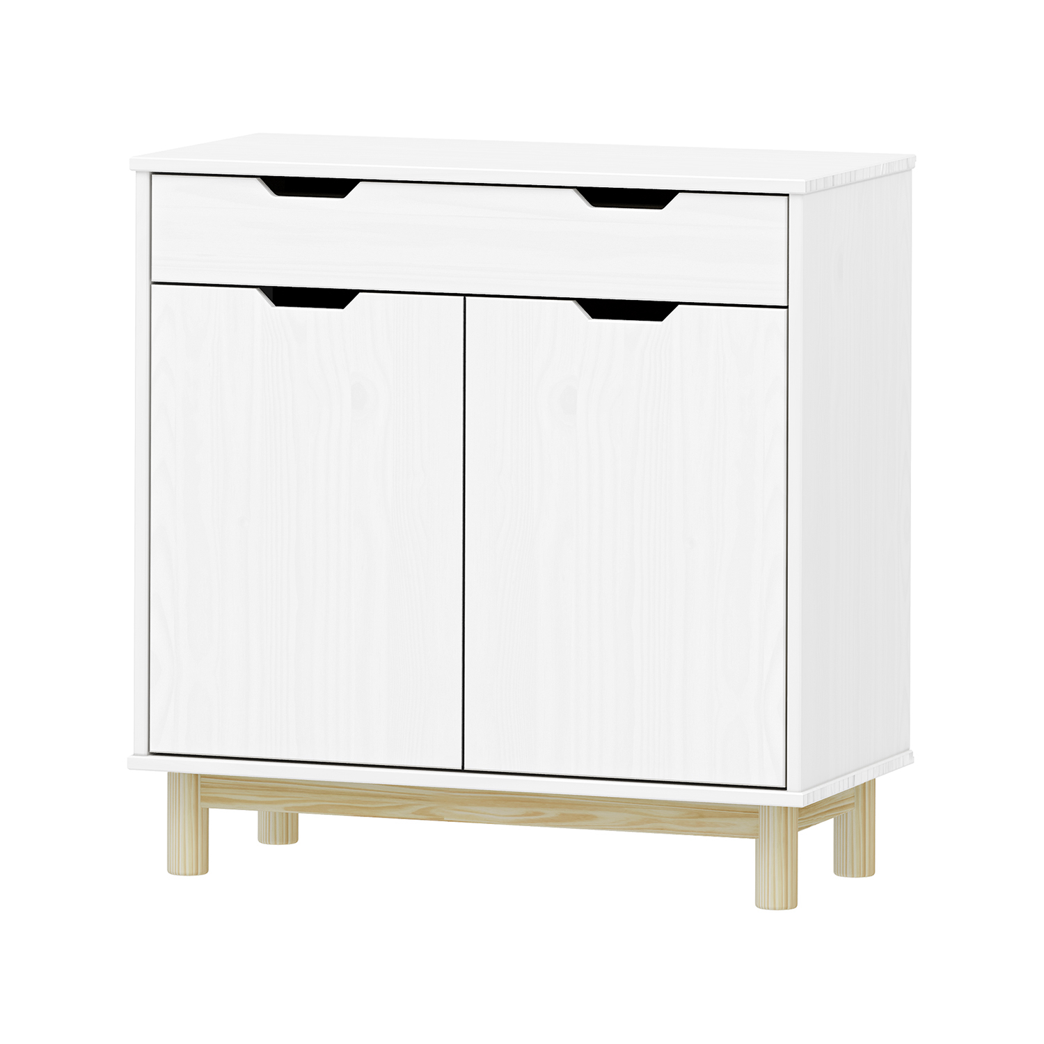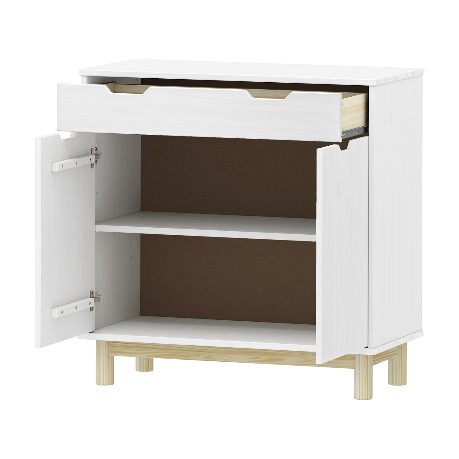 materiál masiv borovice, barevné provedení bílý lak 2 zásuvky s kovovými pojezdy, 1 dvířka, 1 police otvor na protažení kabelů
