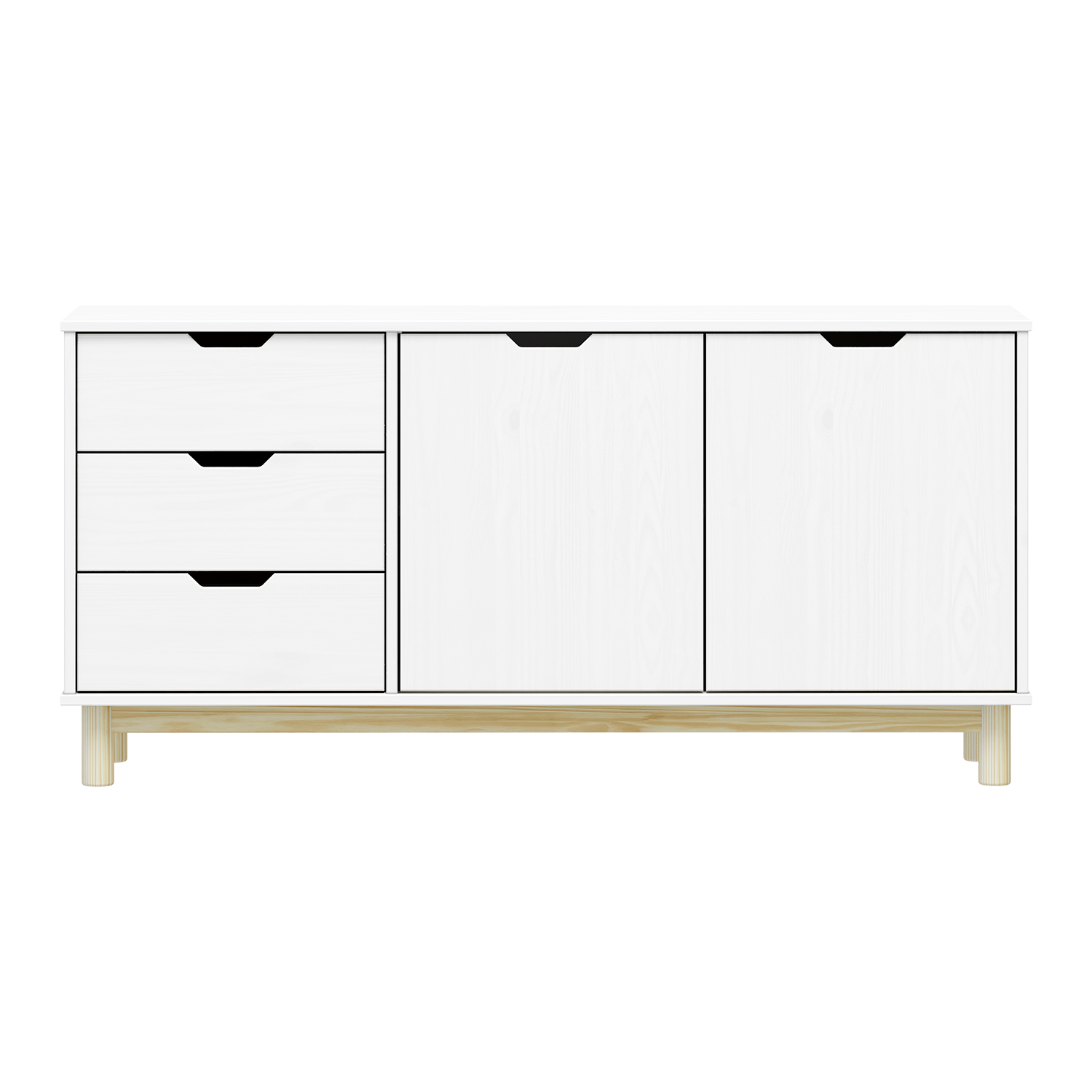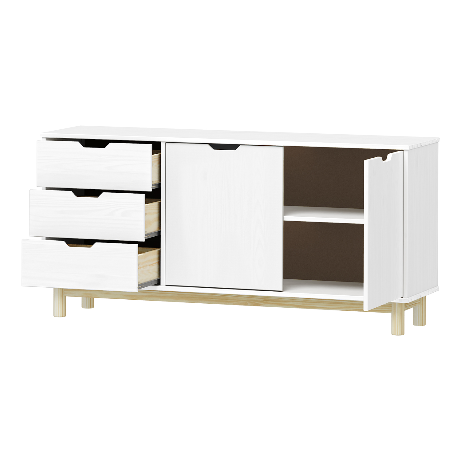 materiál masiv borovice, barevné provedení bílý lak 2 zásuvky s kovovými pojezdy, 1 dvířka, 1 police otvor na protažení kabelů