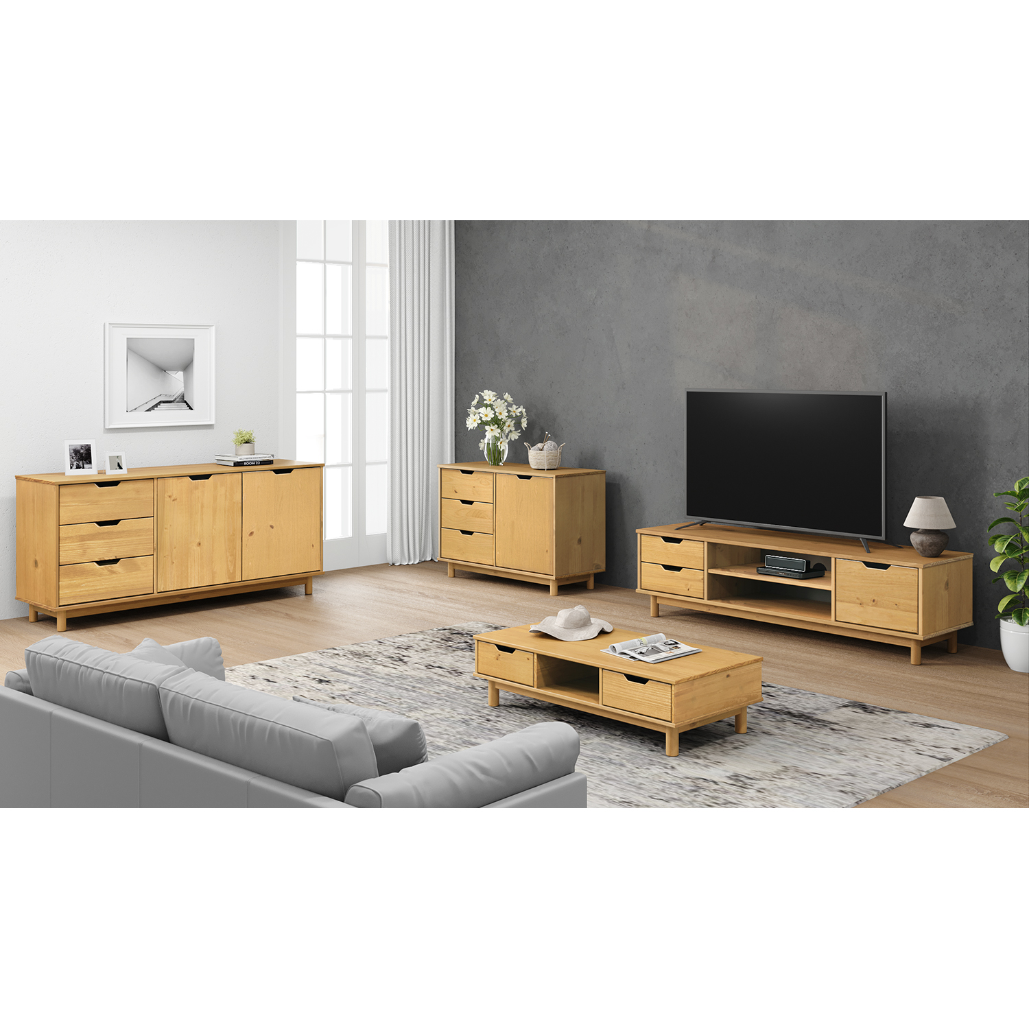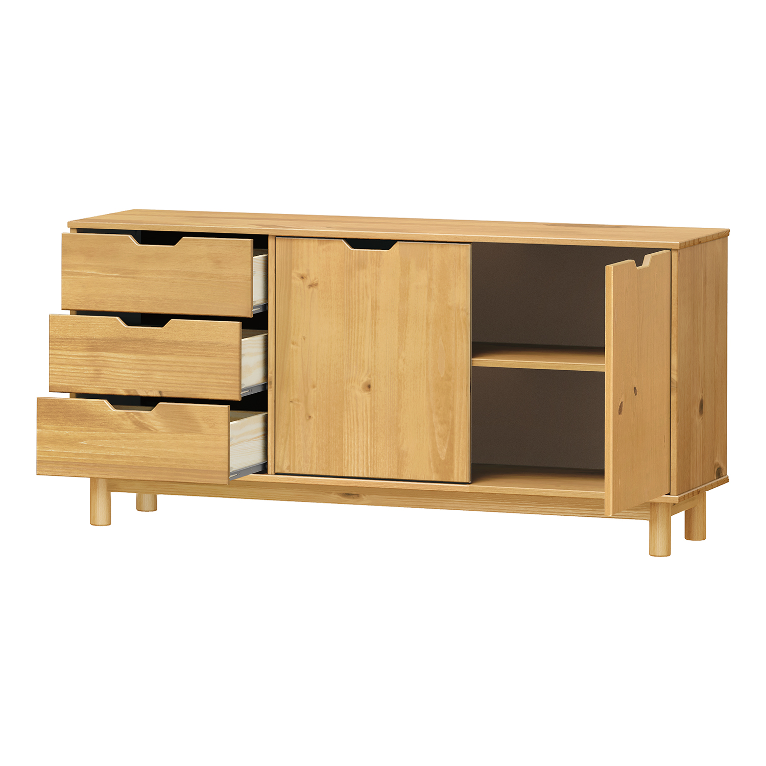 materiál masiv borovice, lakované provedení 2 zásuvky s kovovými pojezdy, 1 dvířka, 1 police otvor na protažení kabelů