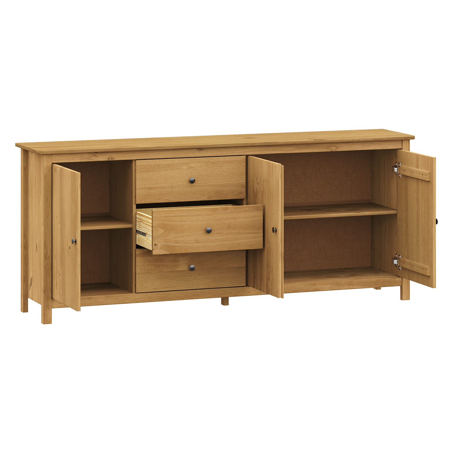 materiál masiv borovice voskovaná v medovém odstínu kovové úchytky v barevném provedení černěná mosaz 2 menší a 3 větší zásuvky s kovovými pojezd...