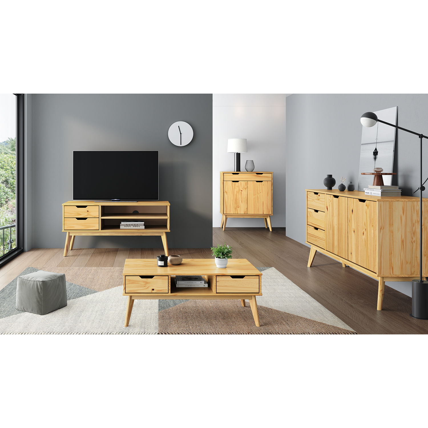 materiál masiv borovice, lakované provedení 2 zásuvky s kovovými pojezdy, 1 dvířka, 1 police otvor na protažení kabelů