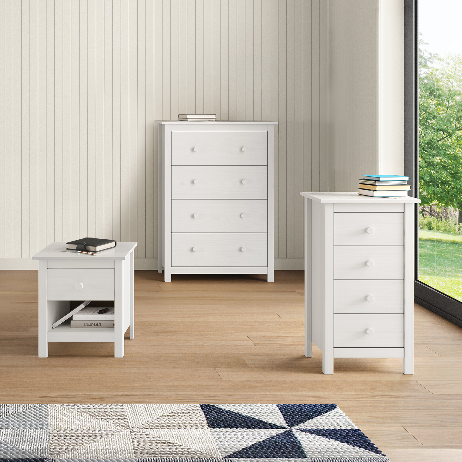 materiál masiv borovice, barevné provedení bílý lak 4 zásuvky s kovovými pojezdy, 2 plné dveře, 1 police