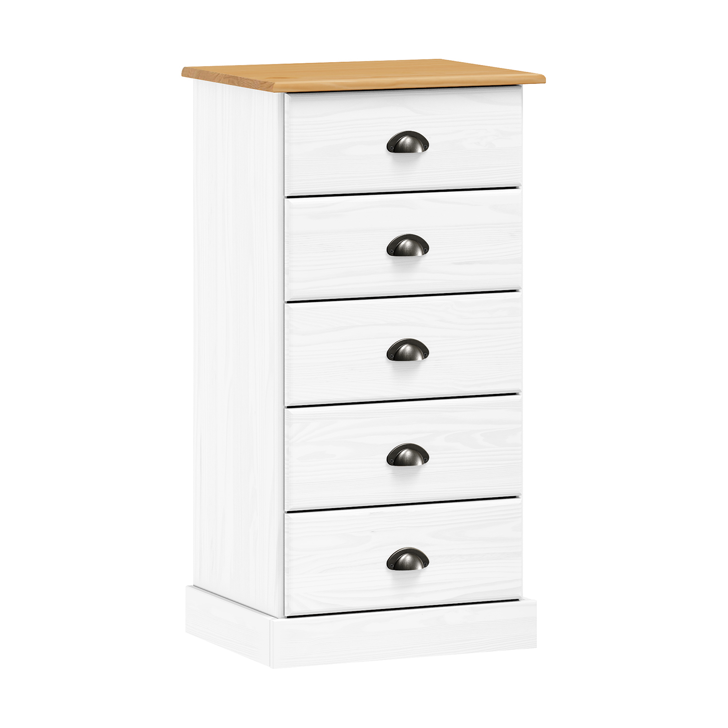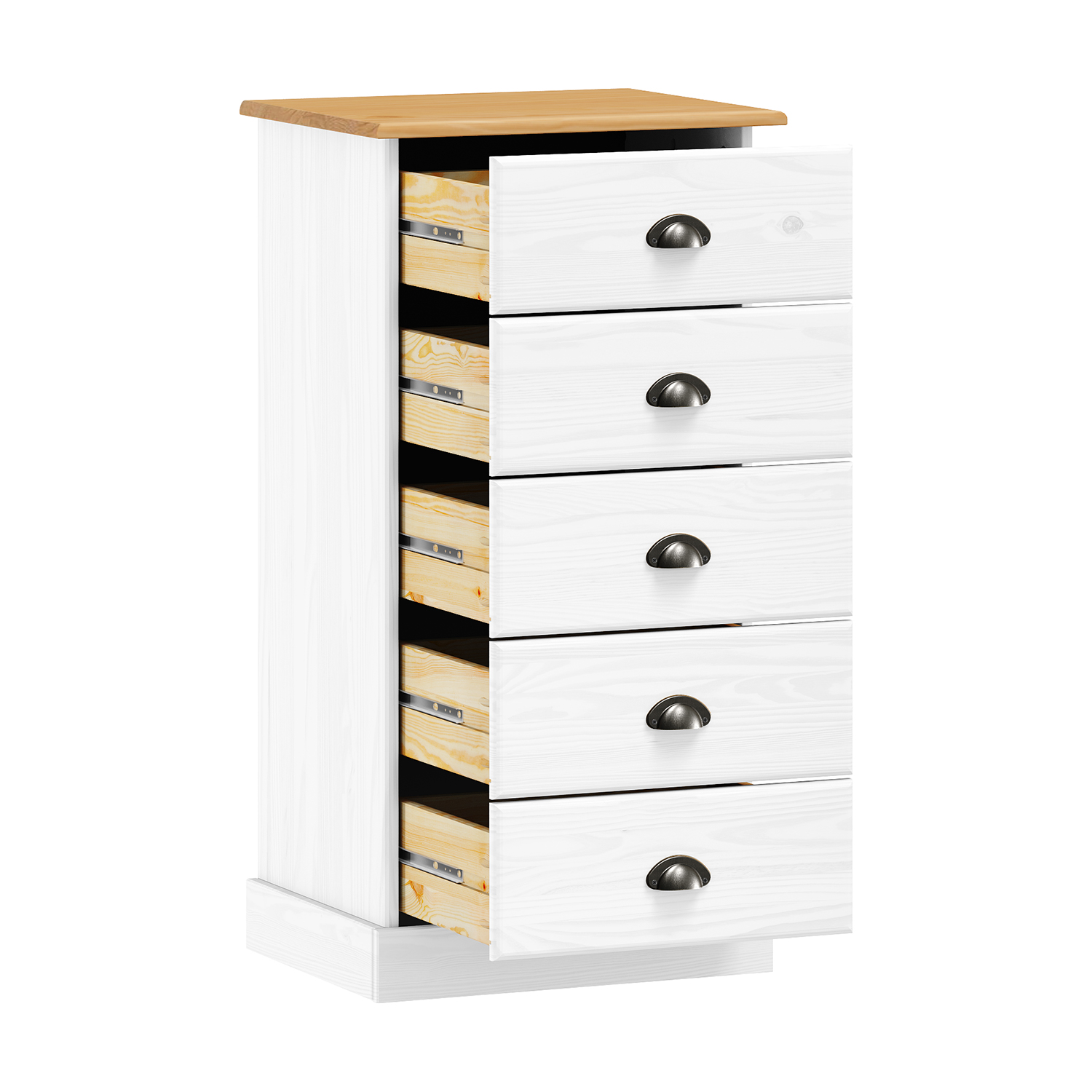 materiál masiv borovice, barevné provedení bílý lak 5 zásuvek s kovovými úchytkami a pojezdy