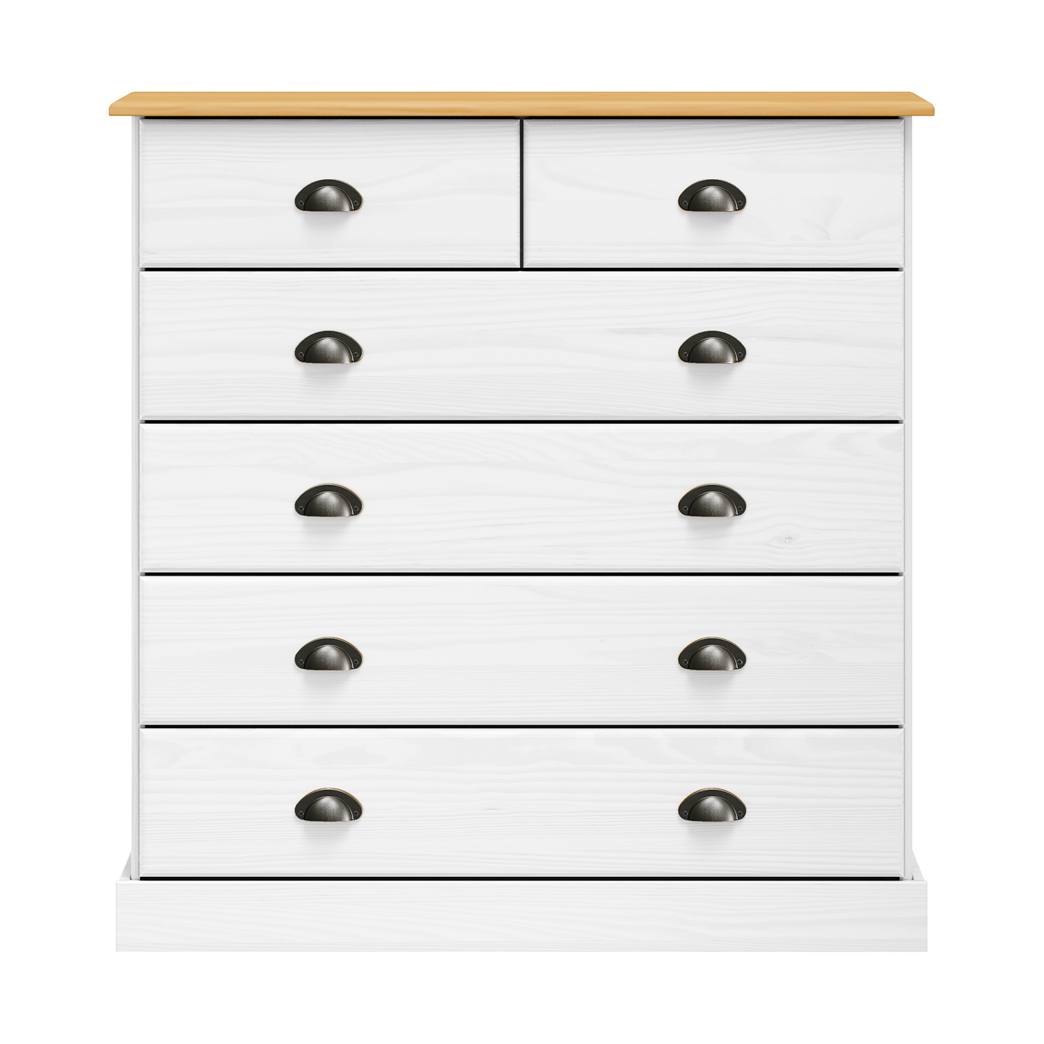 materiál masiv borovice voskovaná v medovém odstínu 6 větších a 3 menší zásuvky s kovovými úchytkami a pojezdy