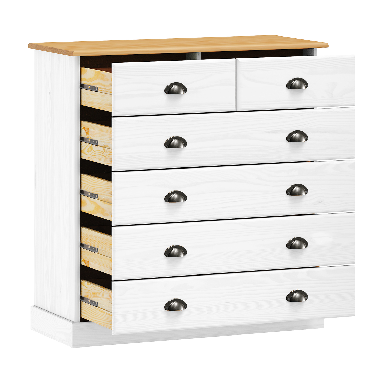 materiál masiv borovice, barevné provedení bílý lak 6 větších a 3 menší zásuvky s kovovými úchytkami a pojezdy