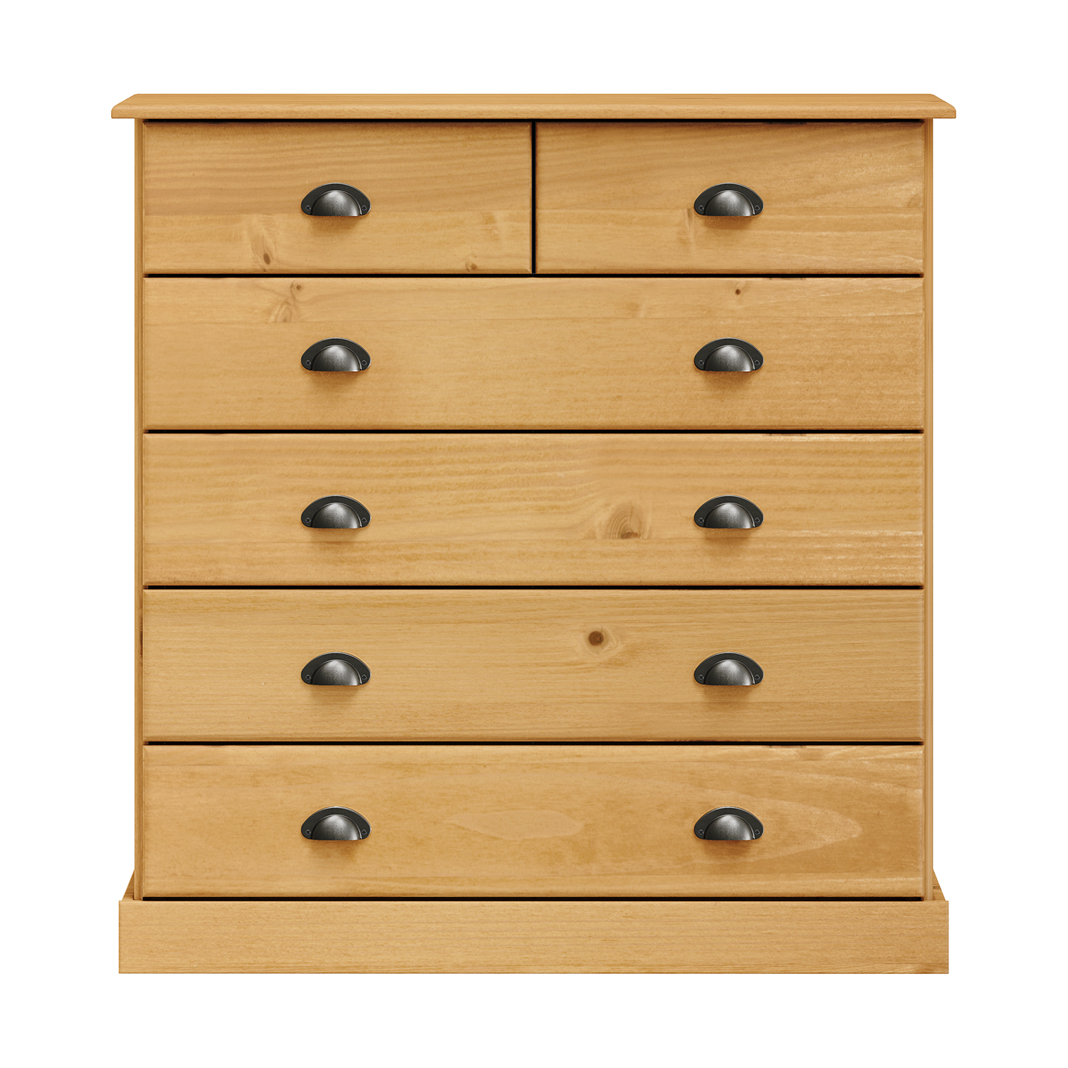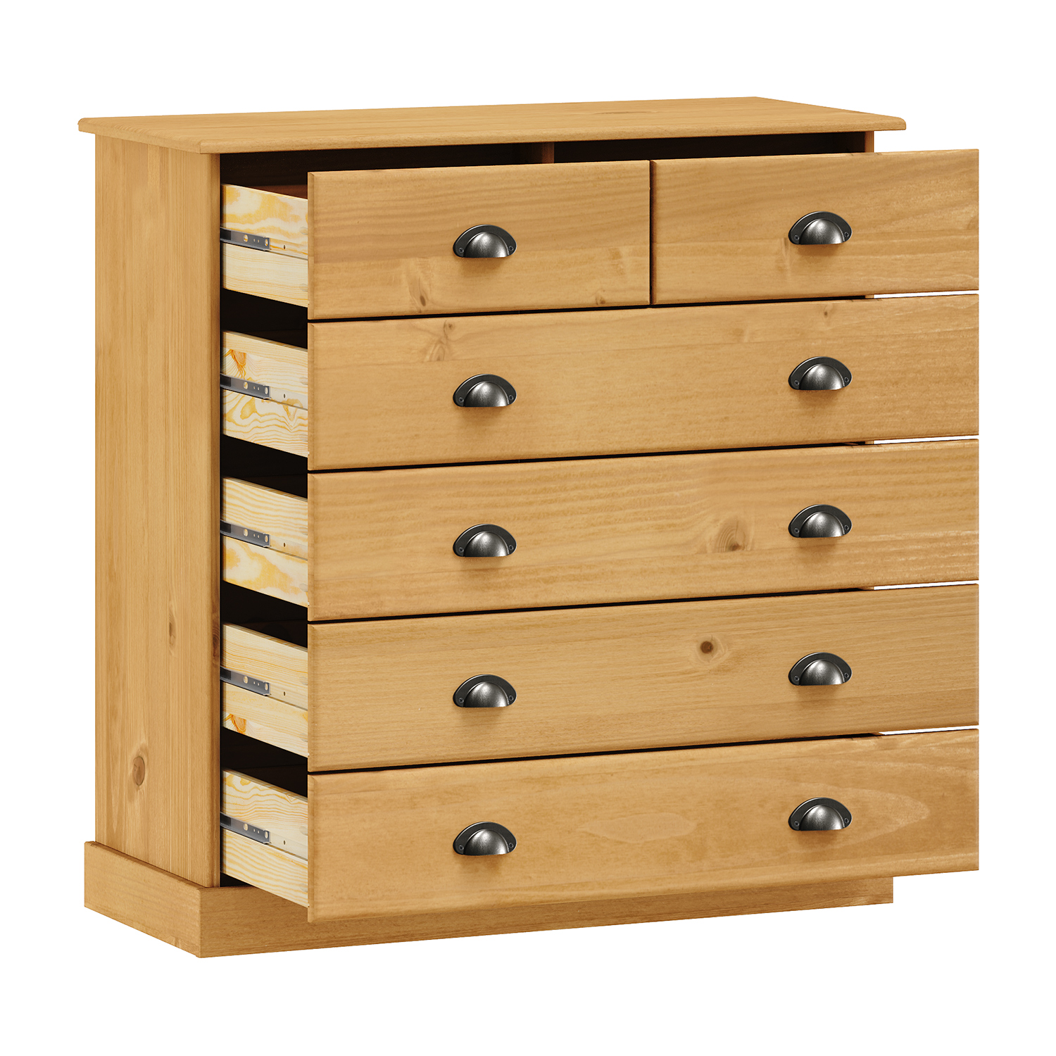 materiál masiv borovice voskovaná v medovém odstínu 6 větších a 3 menší zásuvky s kovovými úchytkami a pojezdy