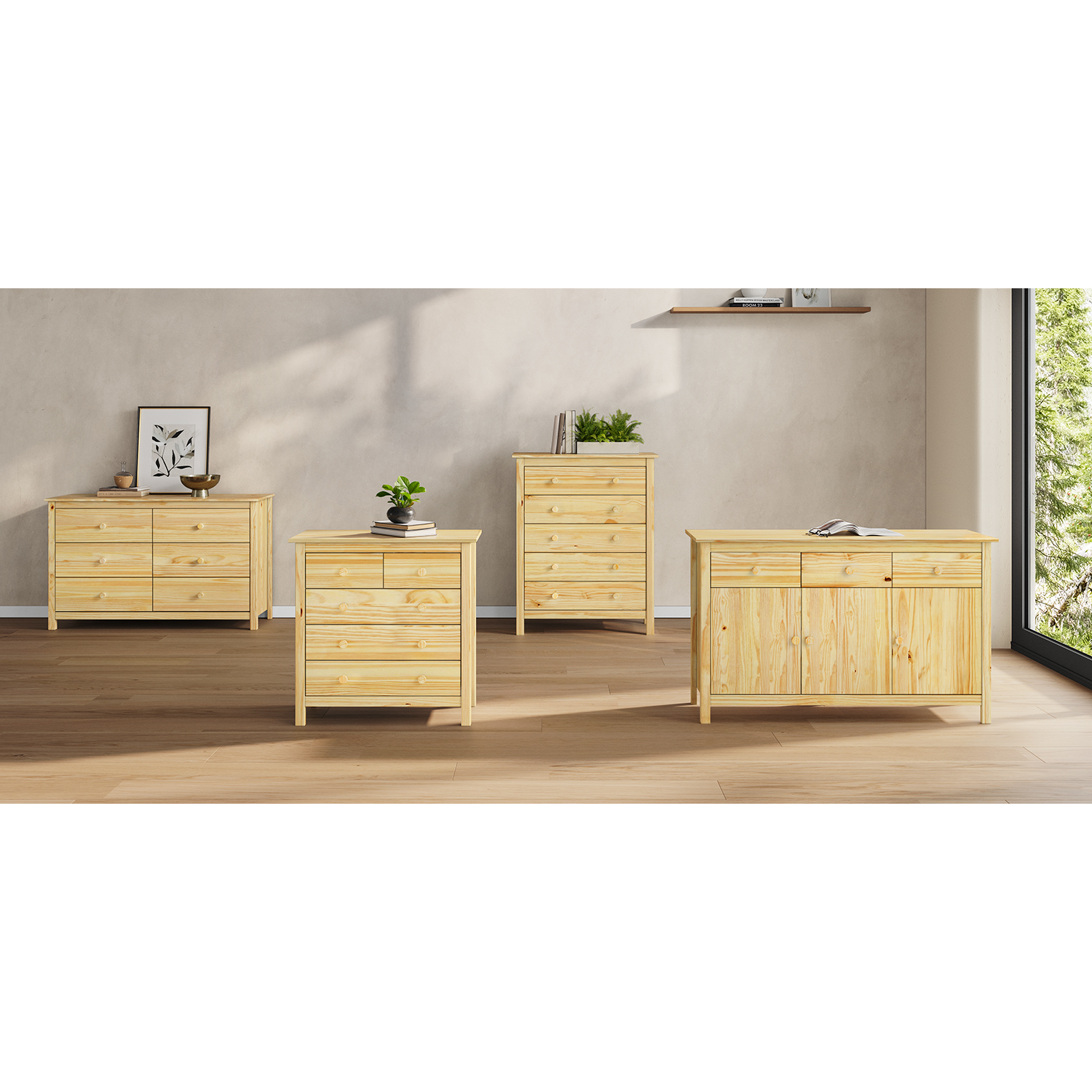 materiál masiv borovice, lakované provedení 4 zásuvky s kovovými pojezdy, 2 plné dveře, 1 police