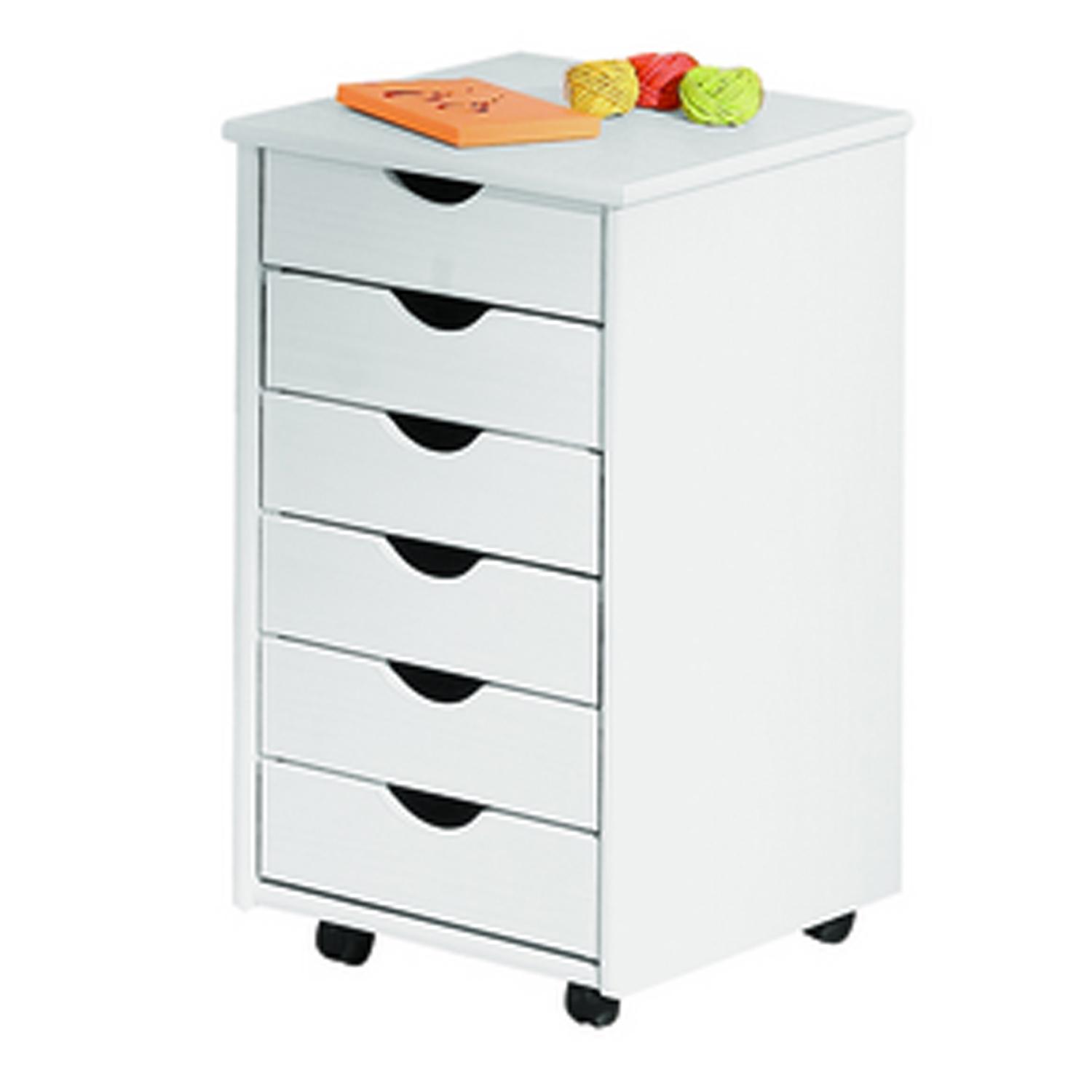 materiál masiv borovice, barevné provedení bílý lak 6 zásuvek, pojízdný na kolečkách vnitřní rozměr zásuvky (š/h/v) 26,7 × 32,5 × 6 cm