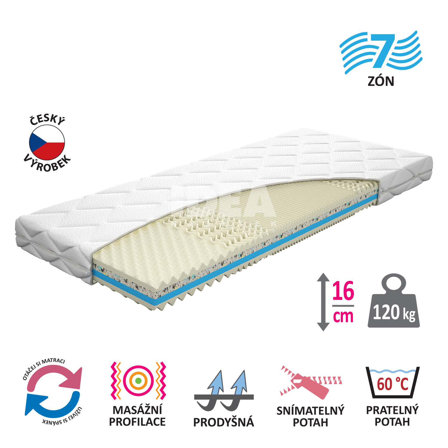 doporučená nosnost do 120 kg, výška matrace 16 cm, výška jádra 14 cm