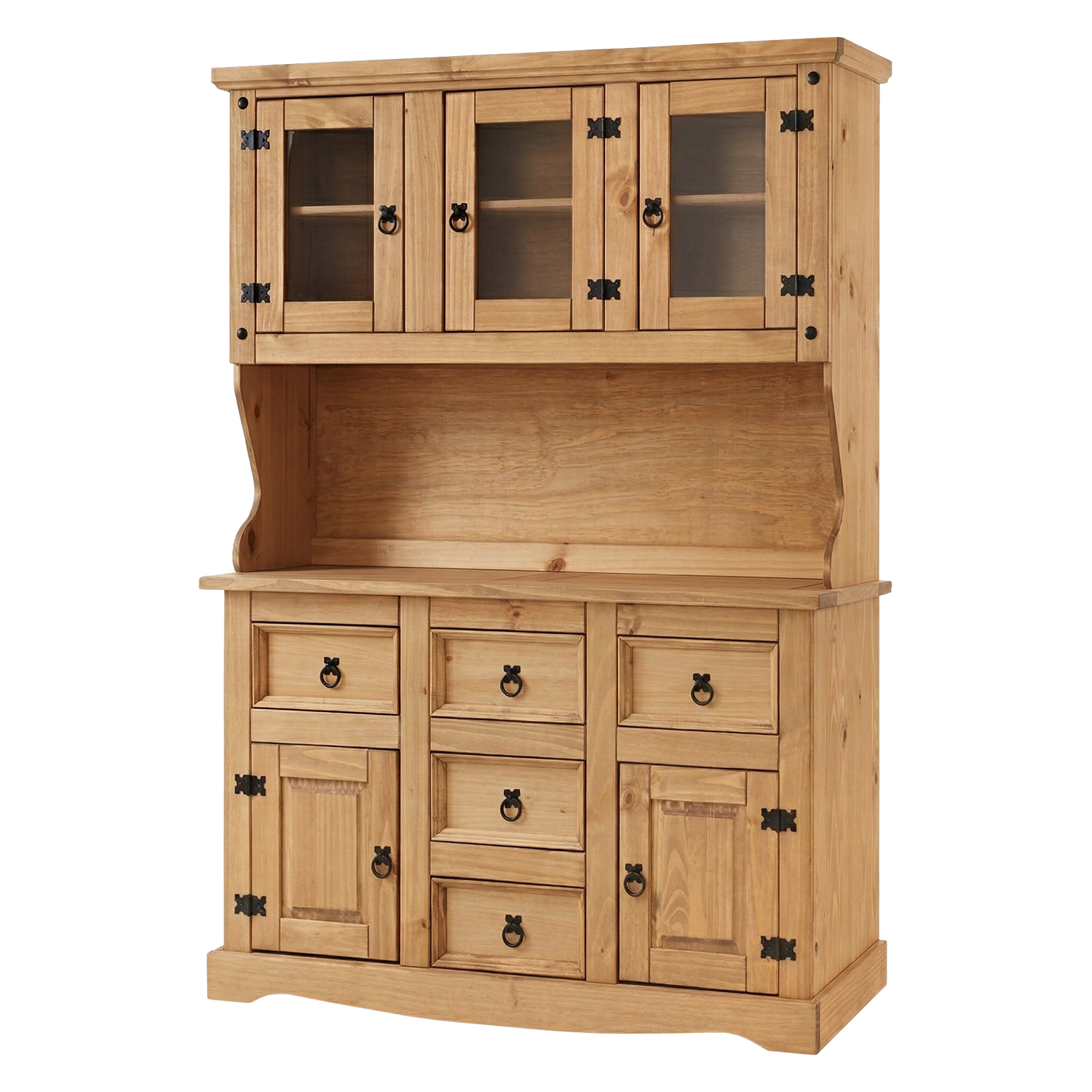 materiál masiv borovice voskovaná v medovém odstínu 3 dvířka, 1 police, 7 zásuvek, kovové ozdobné úchytky součást sestavy Corona