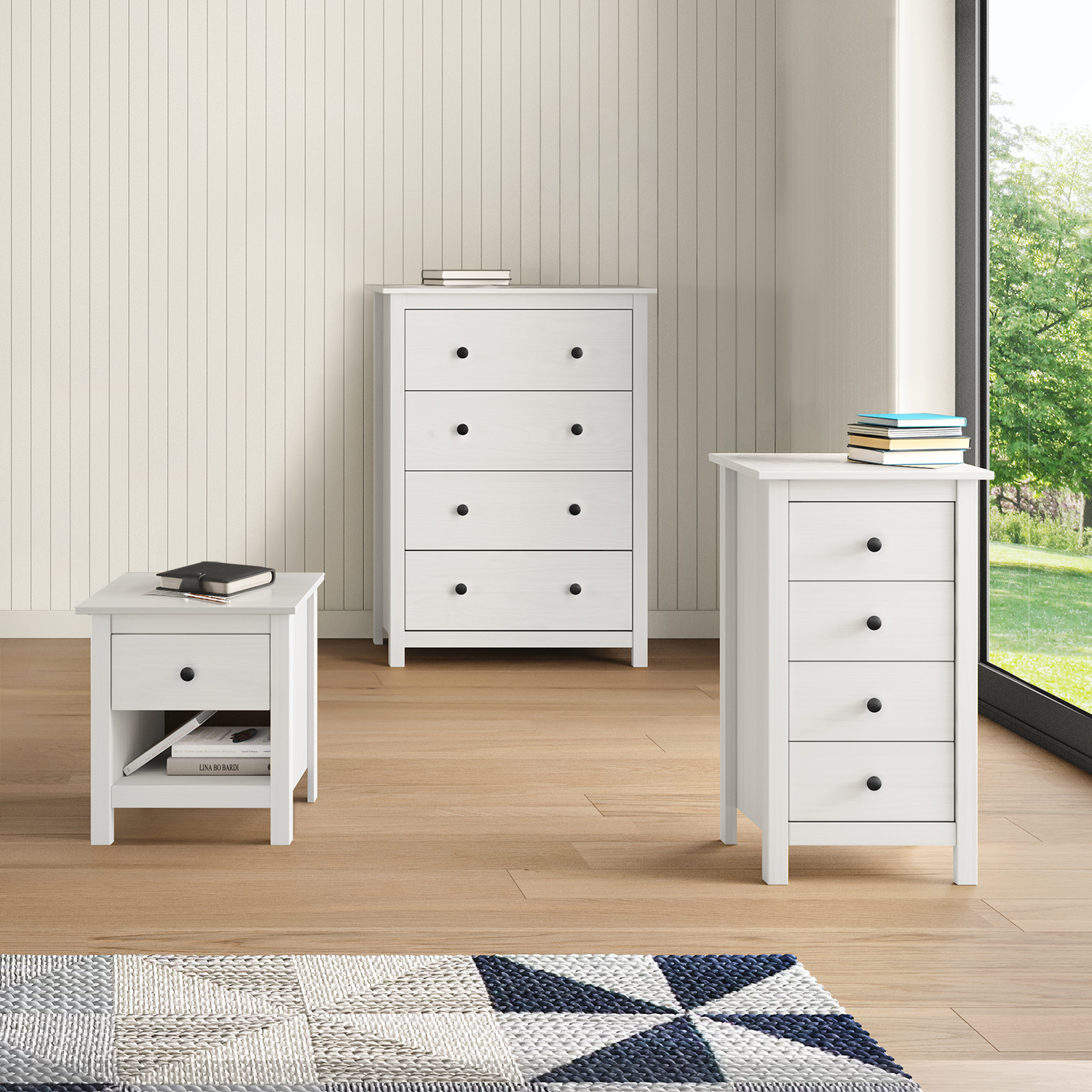 materiál masiv borovice, barevné provedení bílý lak kovové úchytky v barevném provedení černěná mosaz čtyři zásuvky s kovovými pojezdy
