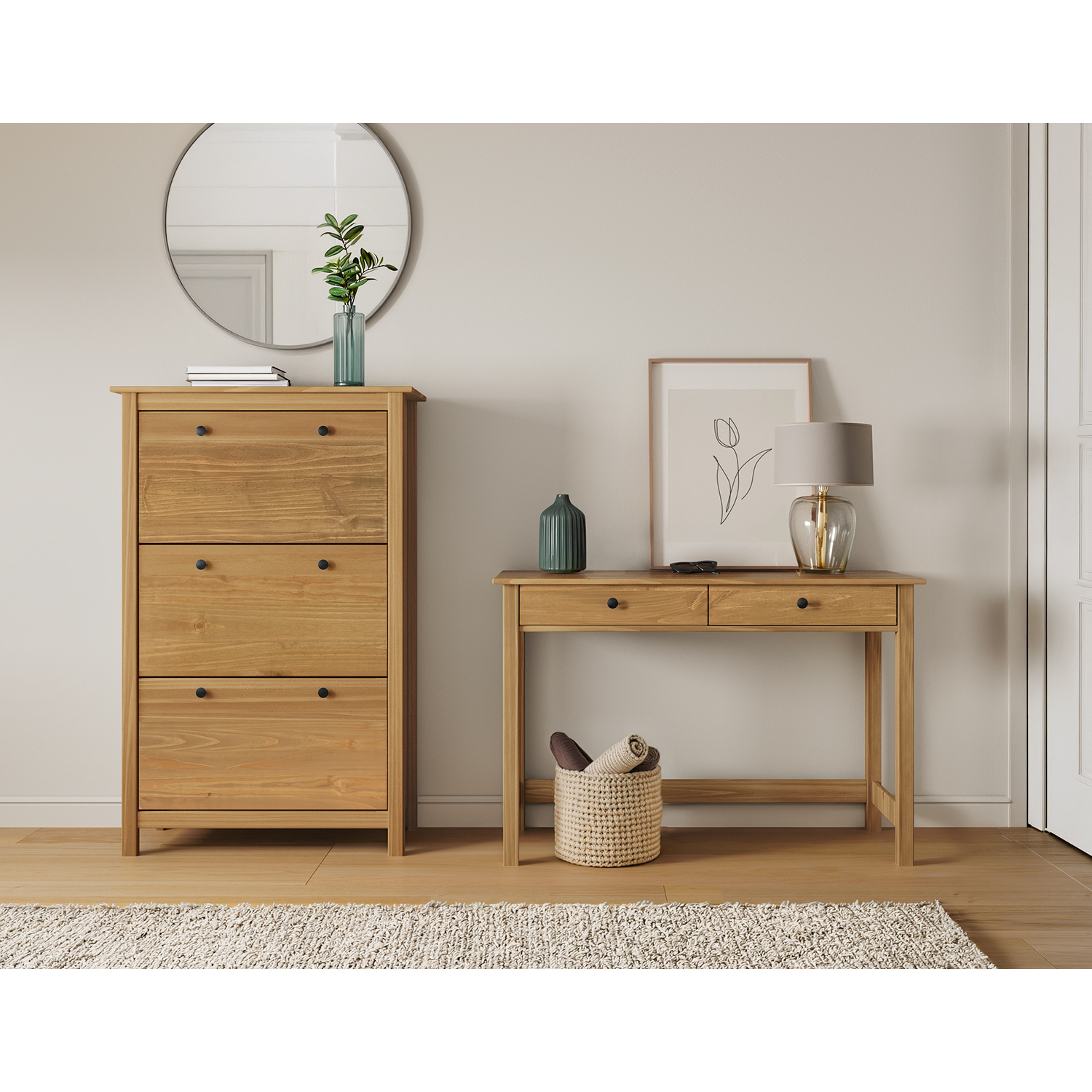 materiál masiv borovice voskovaná v medovém odstínu kovové úchytky v barevném provedení černěná mosaz 2 zásuvky s kovovými pojezdy