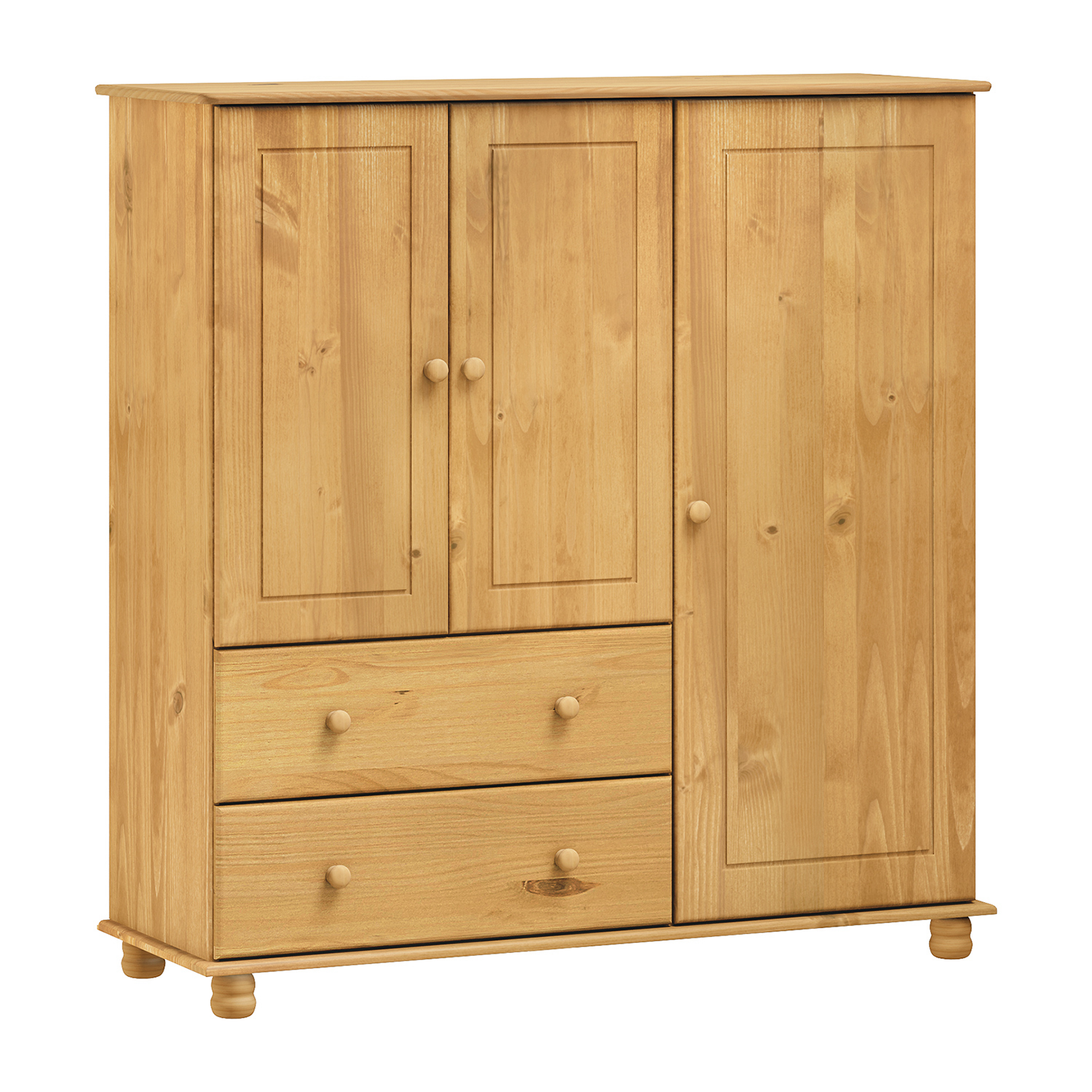 materiál masiv borovice, voskované provedení prostor rozdělený na 2 části, v užší části 1 dvířka a 2 variabilní police v širší části 2 dvířka s 1 variabilní policí, 2 zásuvky s kovovými pojezdy