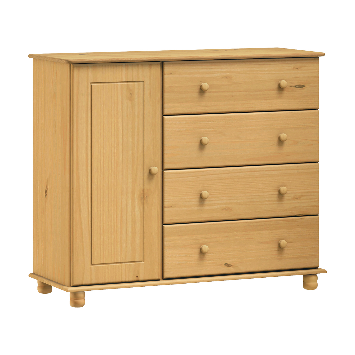 materiál masiv borovice, voskované provedení jedny dvířka, jedna variabilní police 4 široké zásuvky s kovovými pojezdy, hloubka zásuvky 33,5 cm
