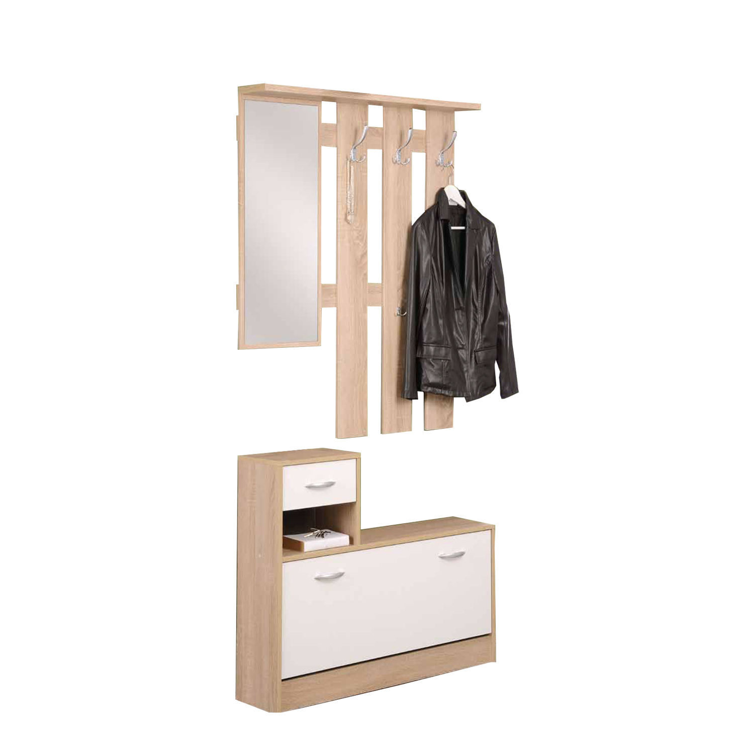 barevné provedení dub Sonoma / bílá sestava obsahuje botník a věšák se zrcadlem botník až pro 8 párů bot s malou zásuvkou věšáková stěna se 3 trojháčky a jedním dvojháčkem