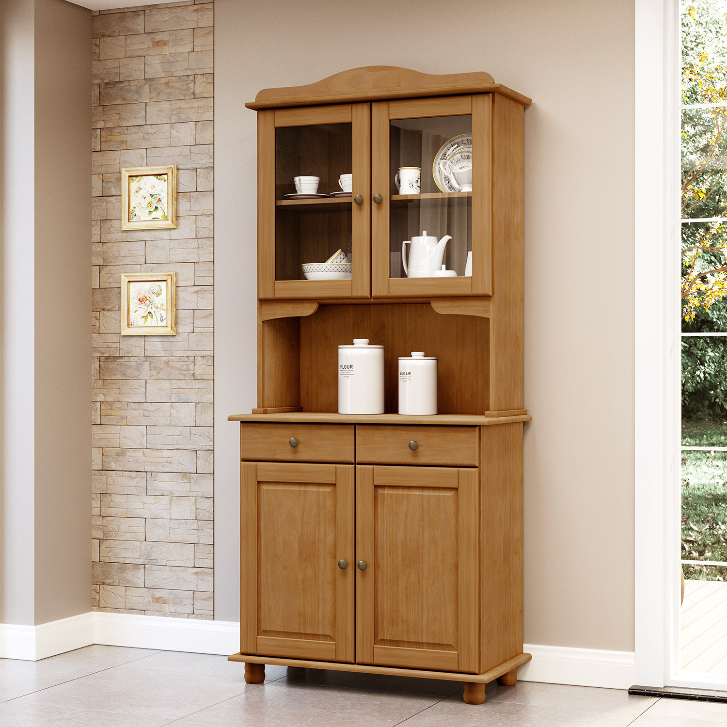 materiál masiv borovice, lakované provedení v dolní části 2 dveře, 2 zásuvky s kovovými pojezdy v horní části dvoje prosklené dveře