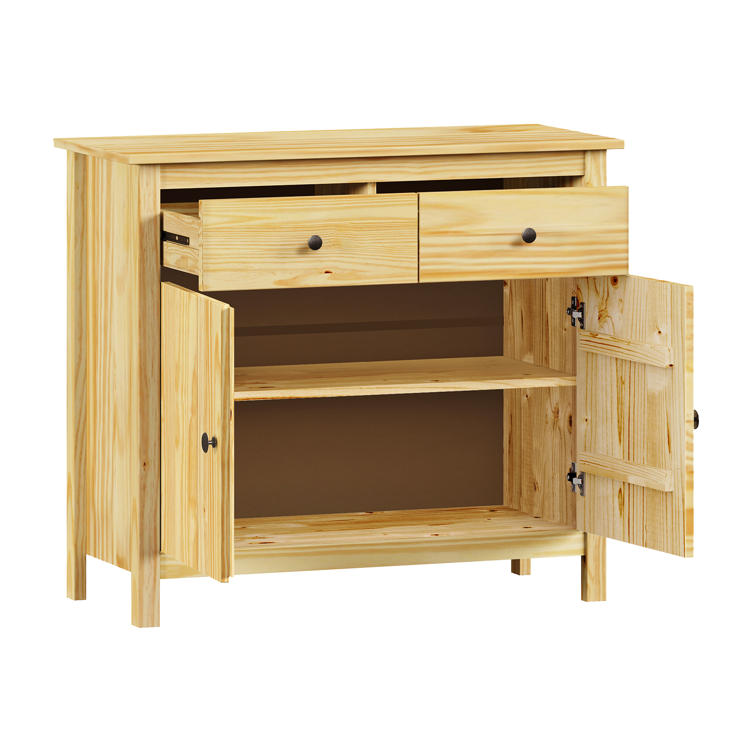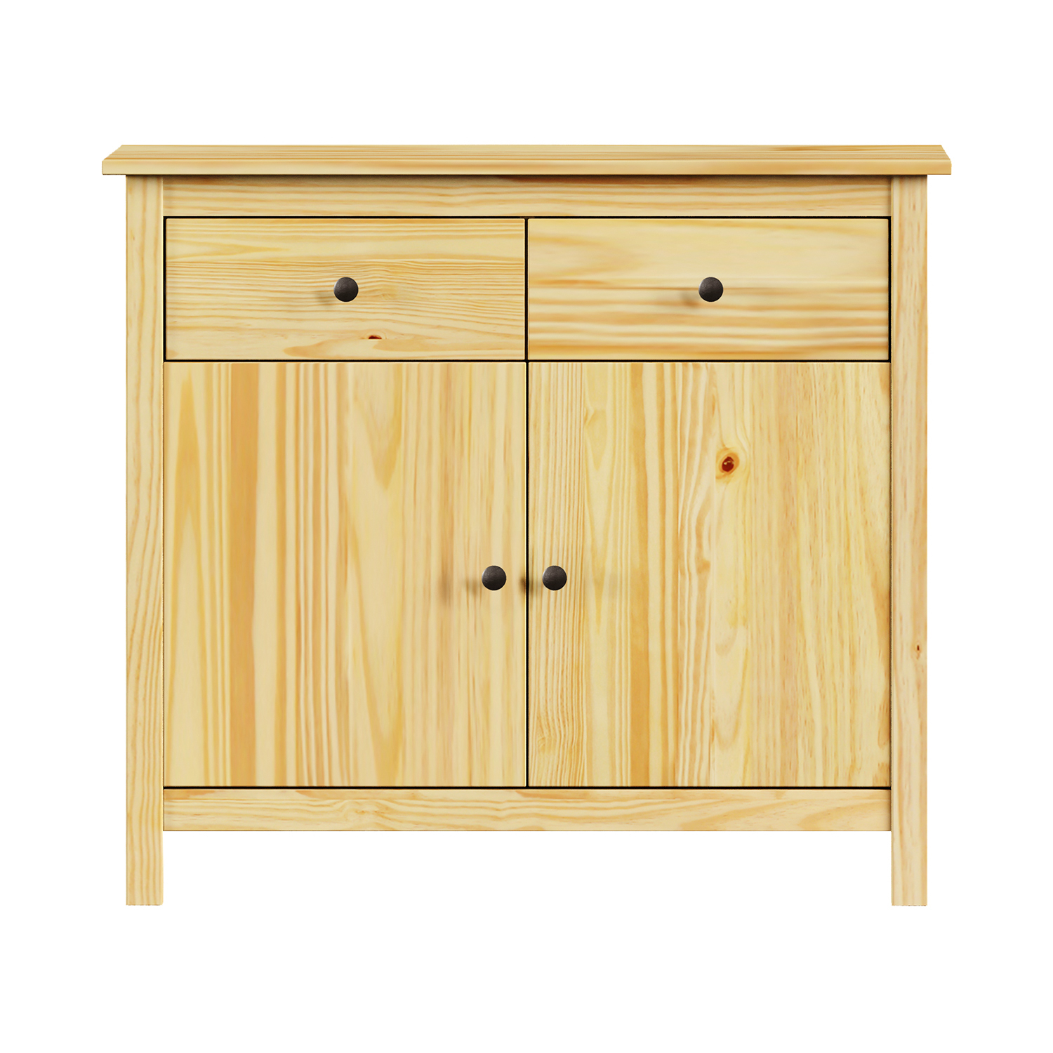 materiál masiv borovice, lakované provedení kovové úchytky v barevném provedení černěná mosaz 2 dvířka a 2 zásuvky s kovovými pojezdy