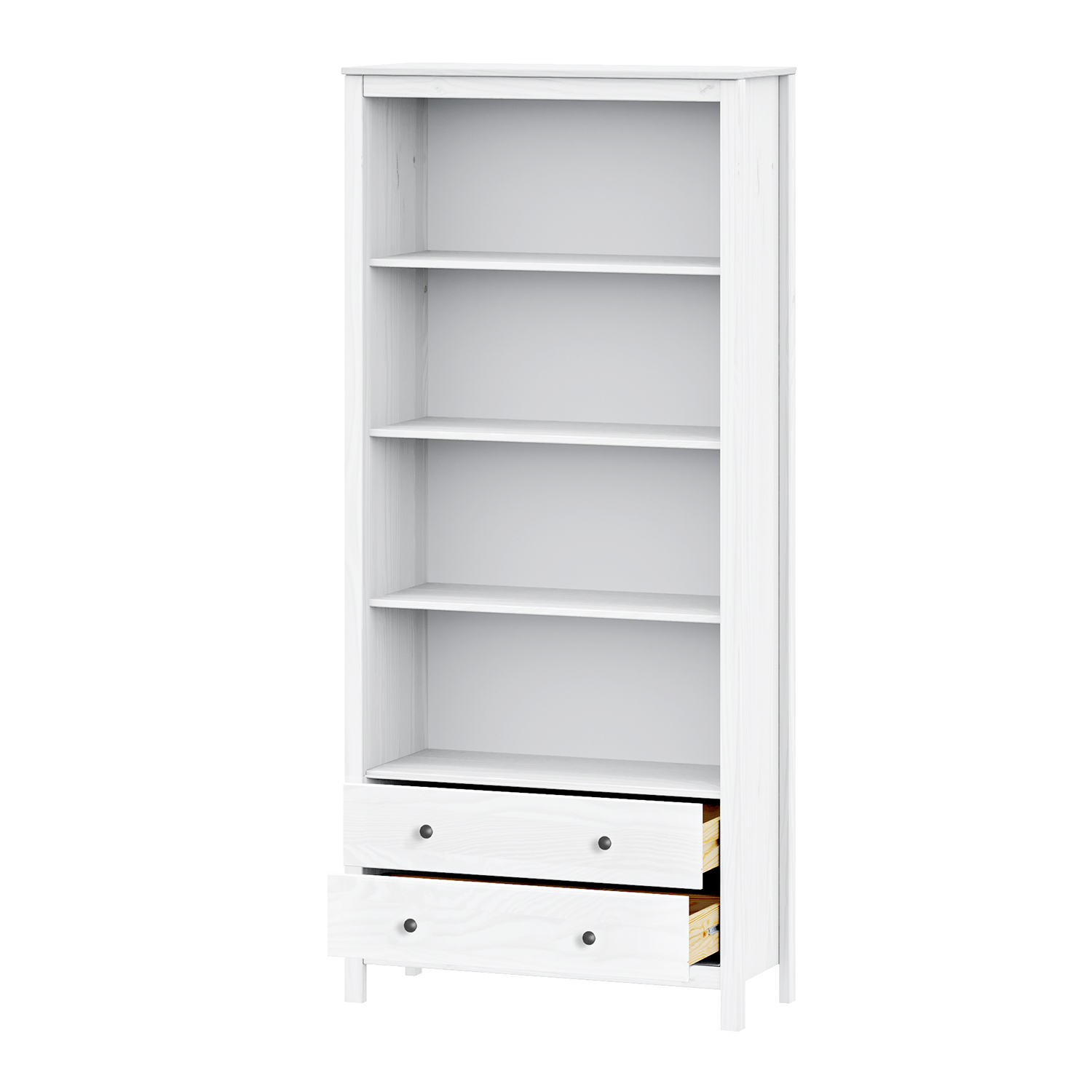 materiál masiv borovice, barevné provedení bílý lak kovové úchytky v barevném provedení černěná mosaz tři police, dvě zásuvky s kovovými poj...