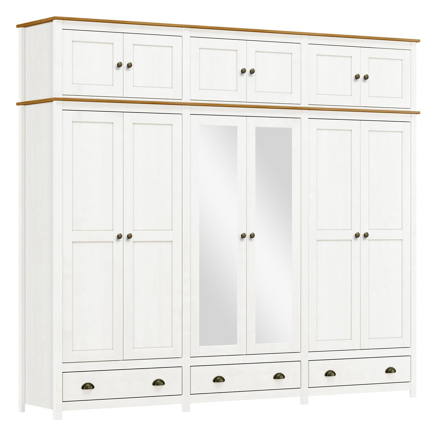 v levé a pravé části 1 police a kovová šatní tyč, ve střední části 3 police, na dvou středních dveřích je zrcadlo