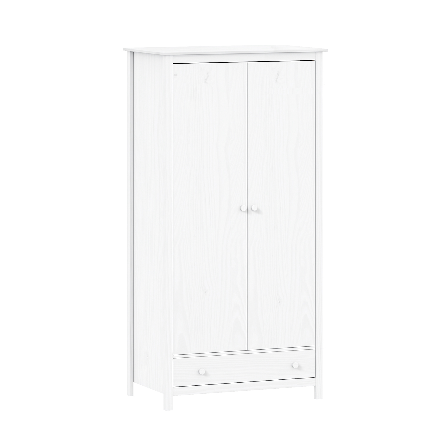 materiál masiv borovice, barevné provedení bílý lak 4 zásuvky s kovovými pojezdy, 2 plné dveře, 1 police
