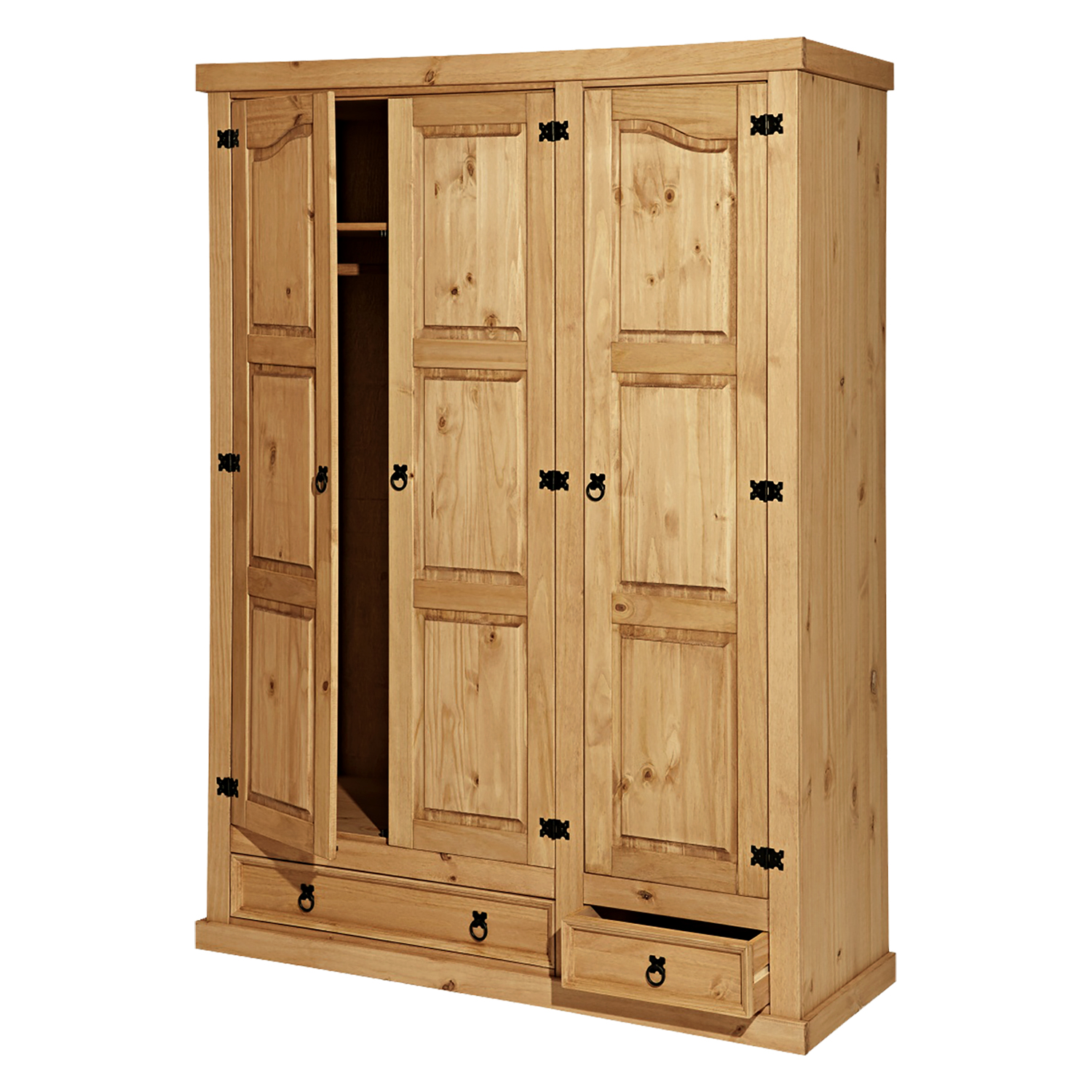 materiál masiv borovice voskovaná v medovém odstínu 2 menší a 2 větší zásuvky, kovové ozdobné úchytky součást sestavy Corona 3
