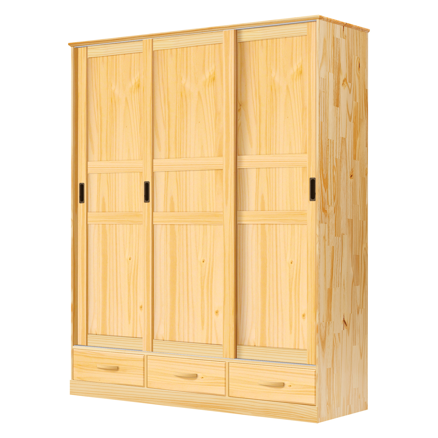 materiál masiv borovice, lakované provedení 3 zásuvky s kovovými pojezdy, 3 posuvné dveře ve střední části 4 police, v levé a pravé části vždy 1 police a kovová šatní tyč