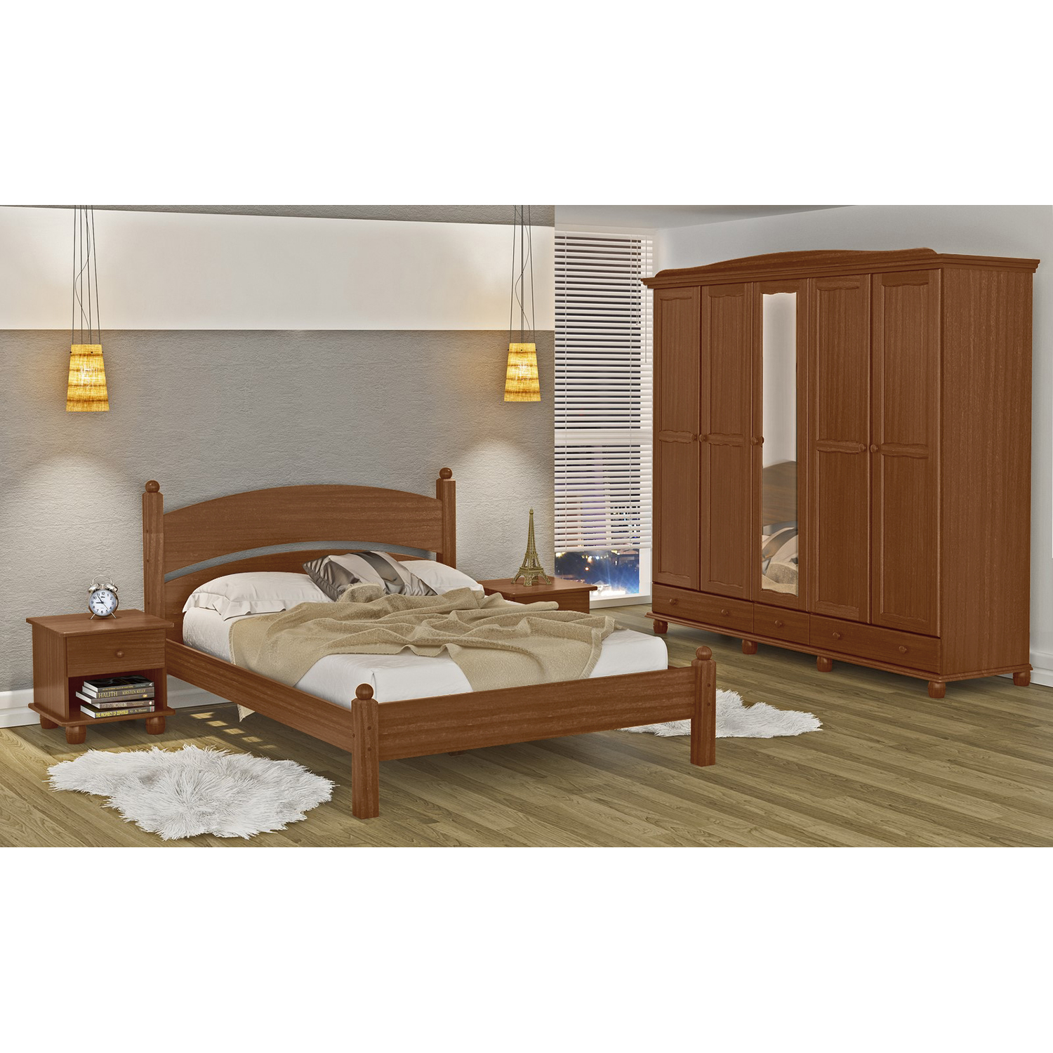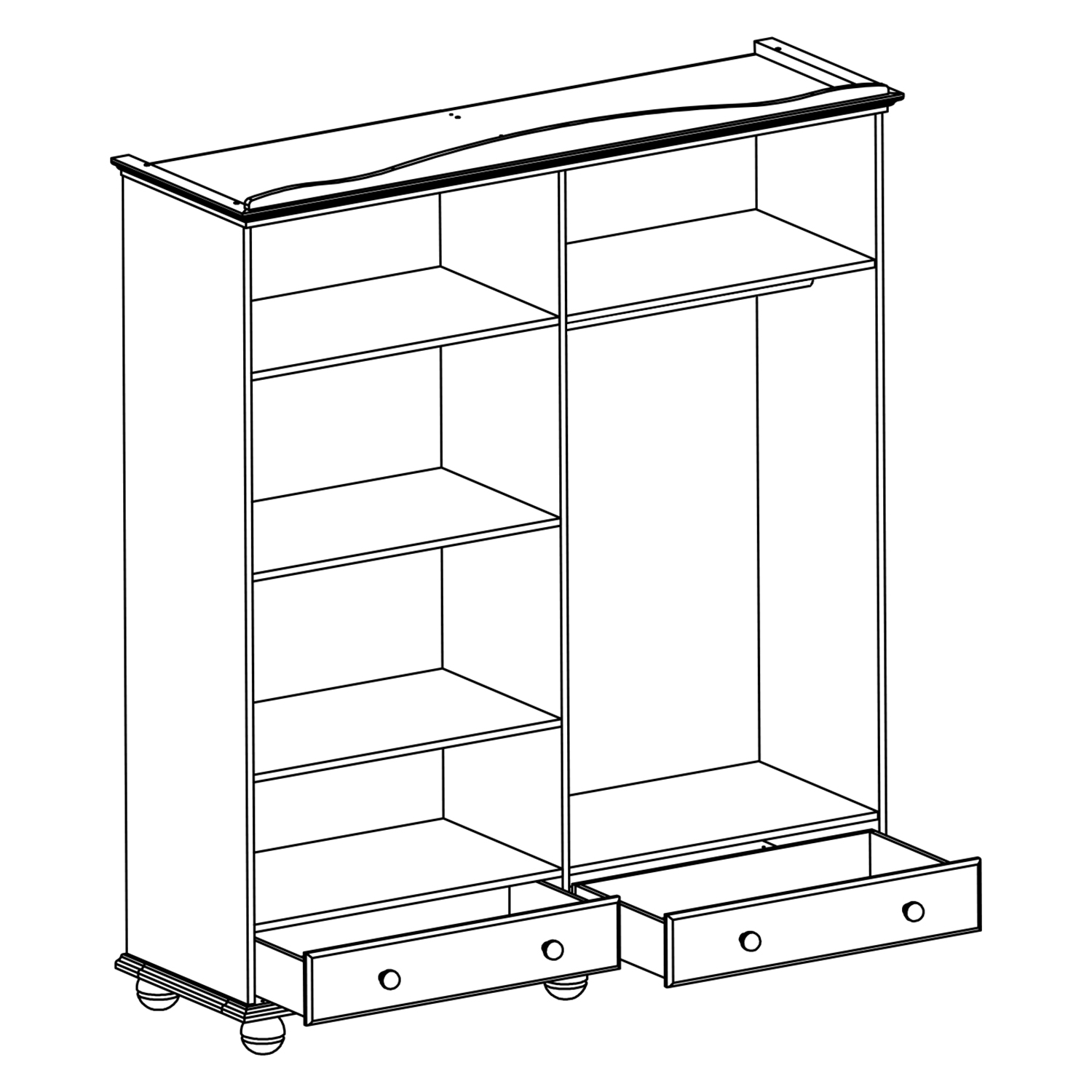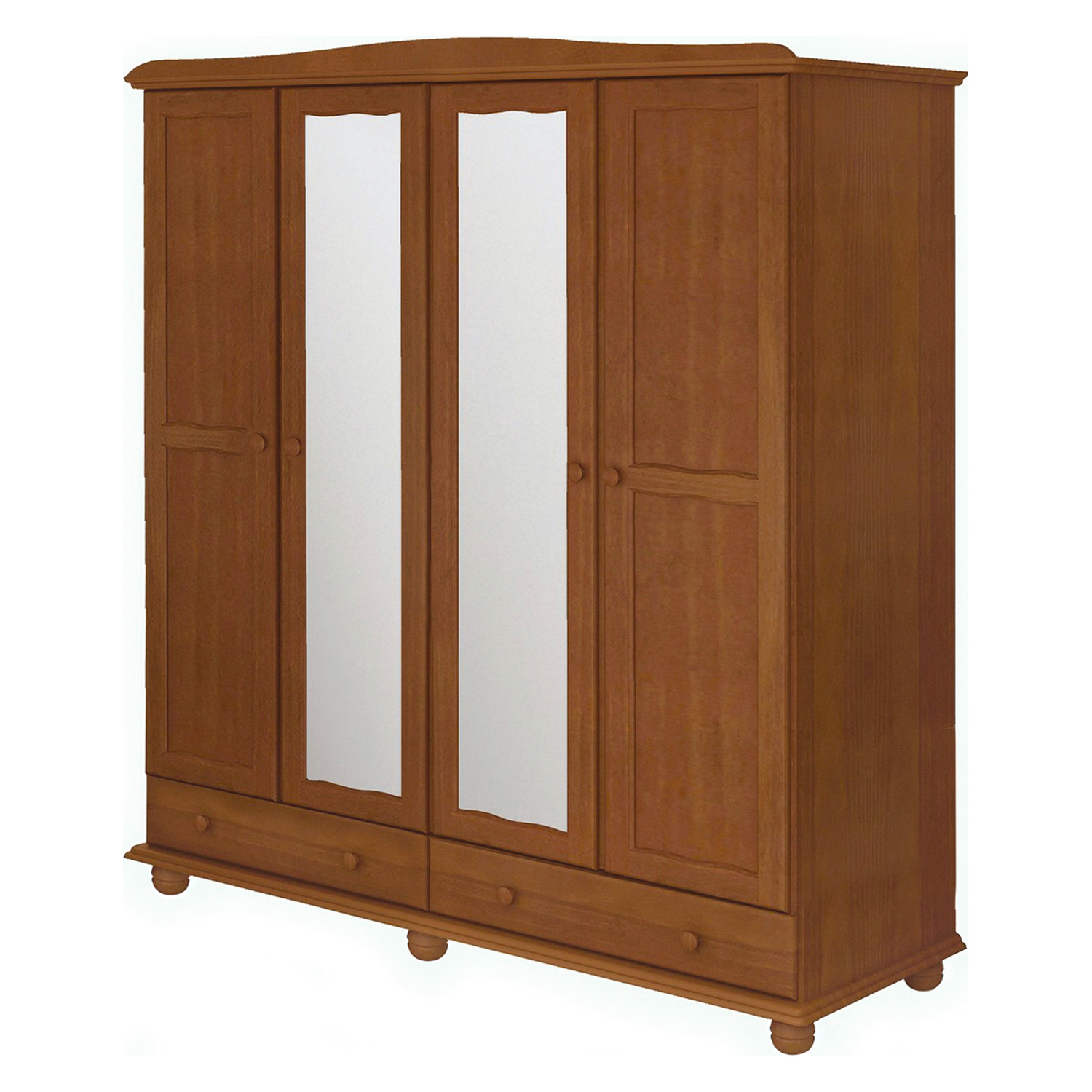 materiál masiv borovice, barevné provedení hnědý lak prostor dělený na poloviny, na obou středních dveřích zrcadlo v levé části 3 police, v pravé části šatní tyč a police v dolní části 2 zásuvky s kovovými pojezdy