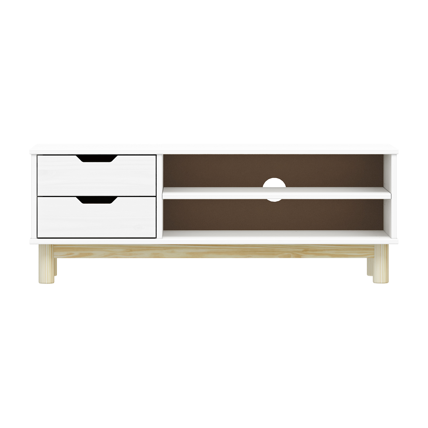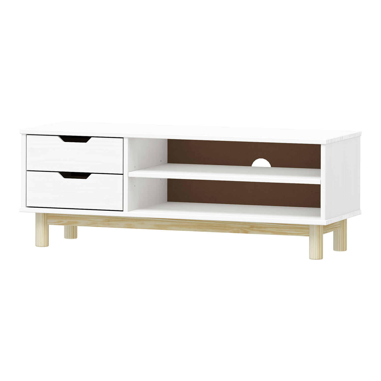materiál masiv borovice, barevné provedení bílý lak 2 zásuvky s kovovými pojezdy, 1 dvířka, 1 police otvor na protažení kabelů