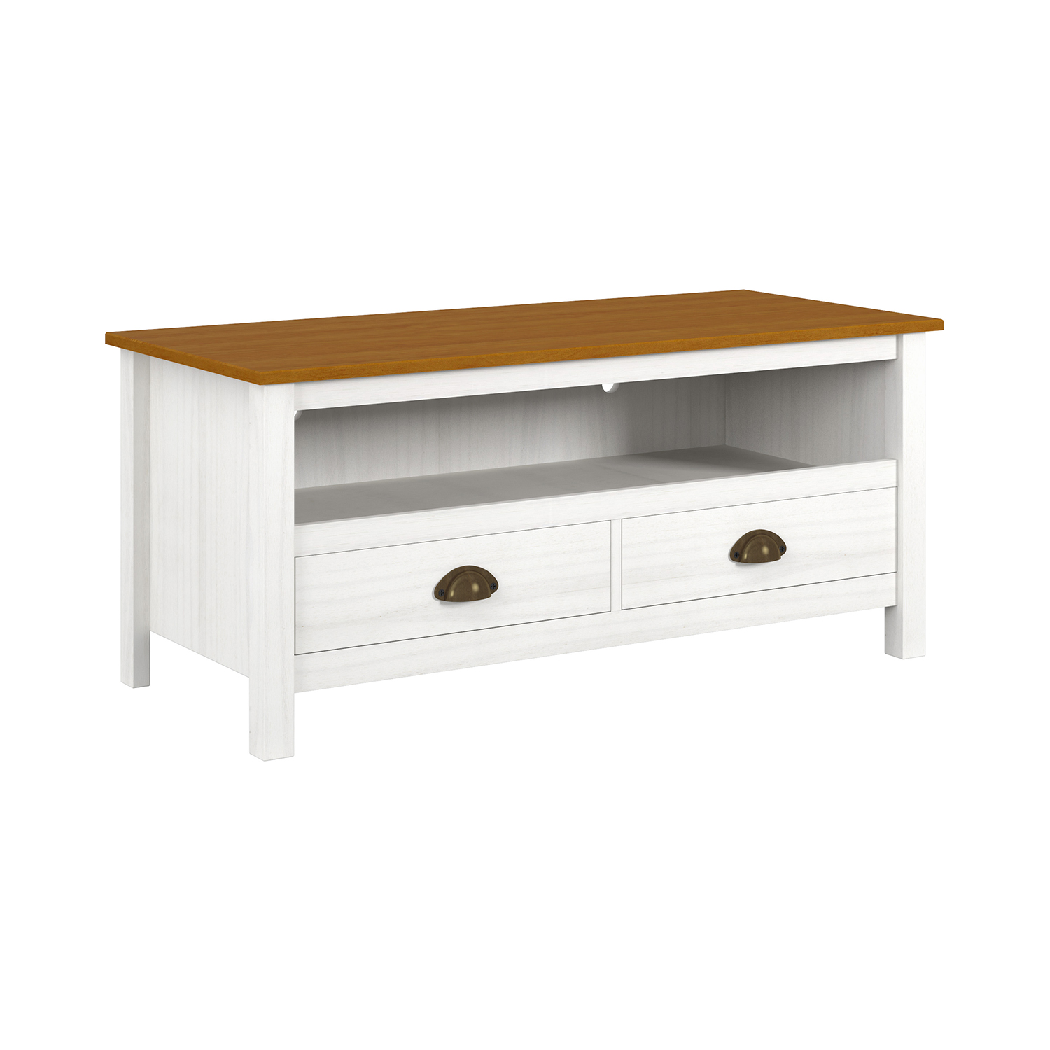 materiál masiv borovice, barevné provedení bílý / hnědý lak 2 zásuvky s kovovými úchytkami a pojezdy, 2 dveře