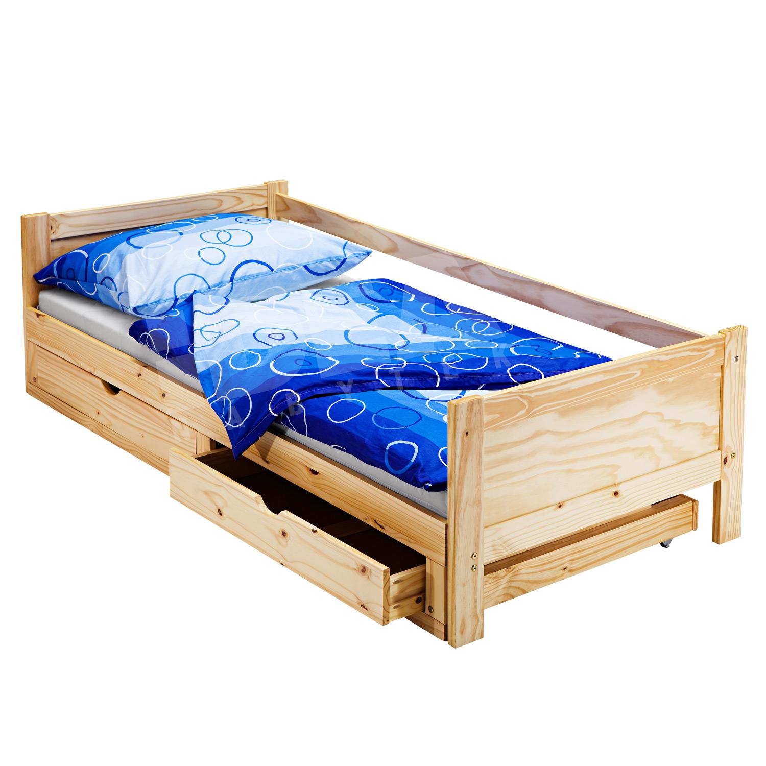 materiál masiv borovice, lakované provedení výška sedu 52 cm, praktické úložné prostory pod postelí (3 zásuvky a výsuv) jsou v ceně cena včetně roštu ...