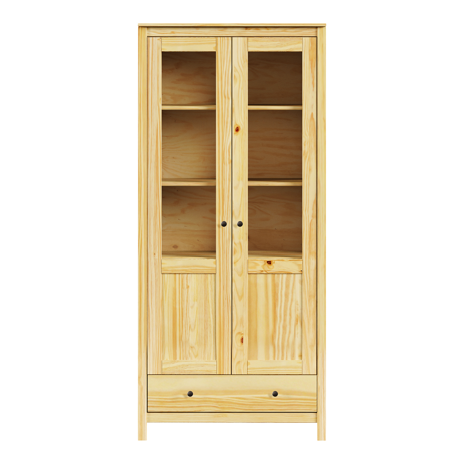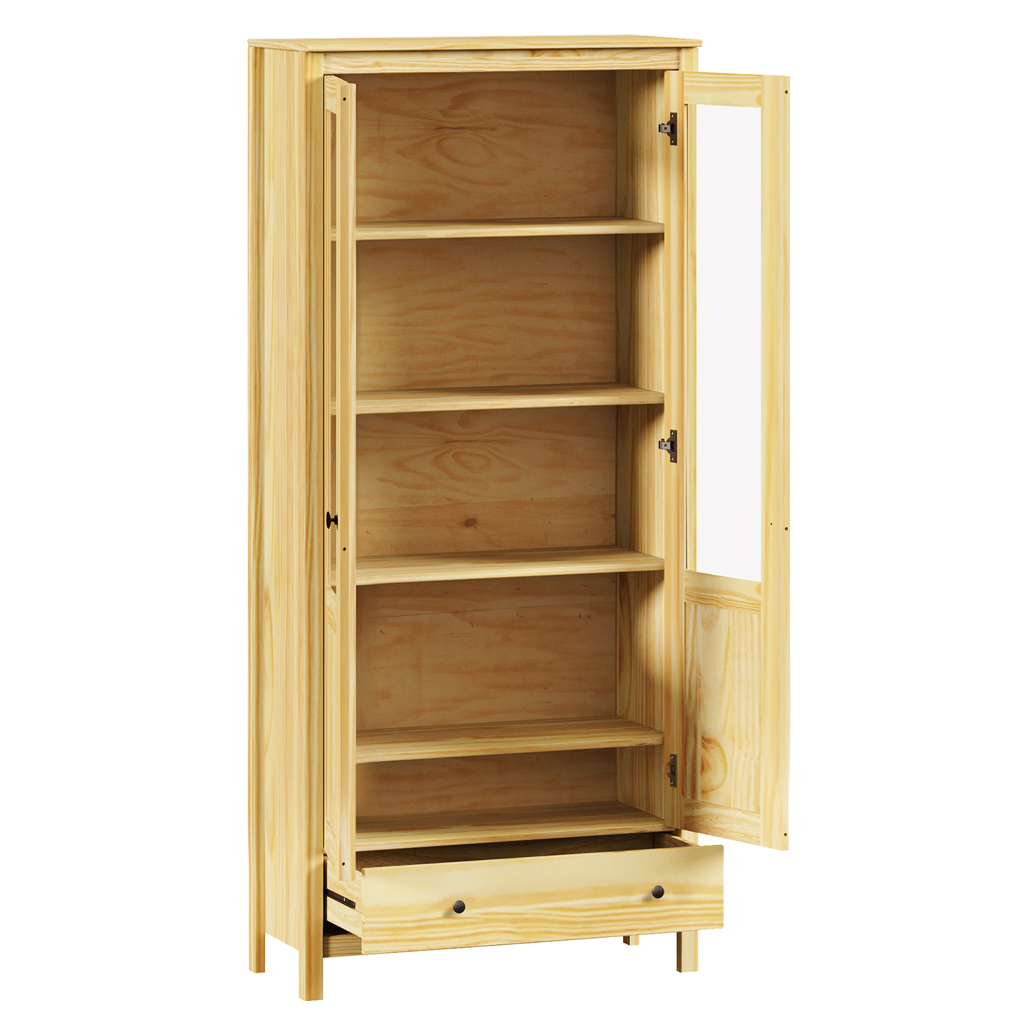 materiál masiv borovice, lakované provedení kovové úchytky v barevném provedení černěná mosaz dvoje částečně prosklené dveře, čtyři police