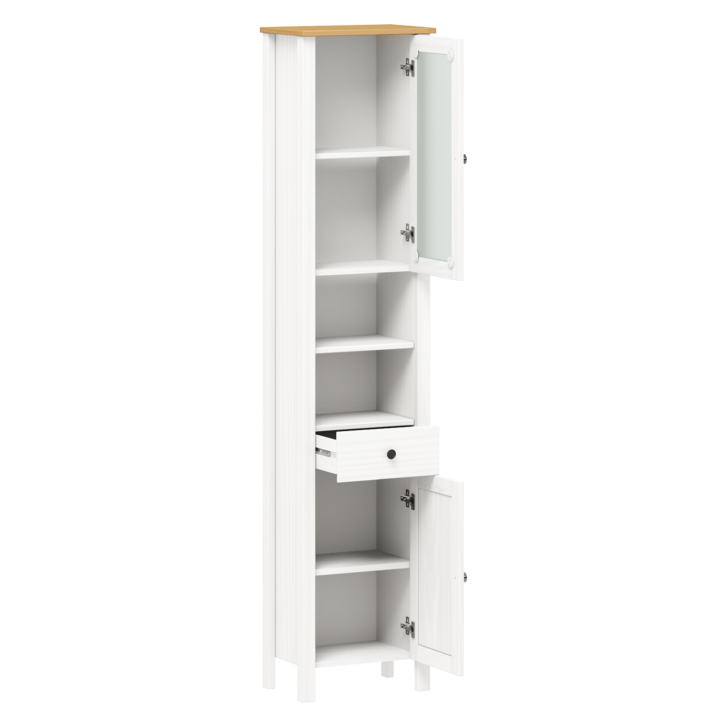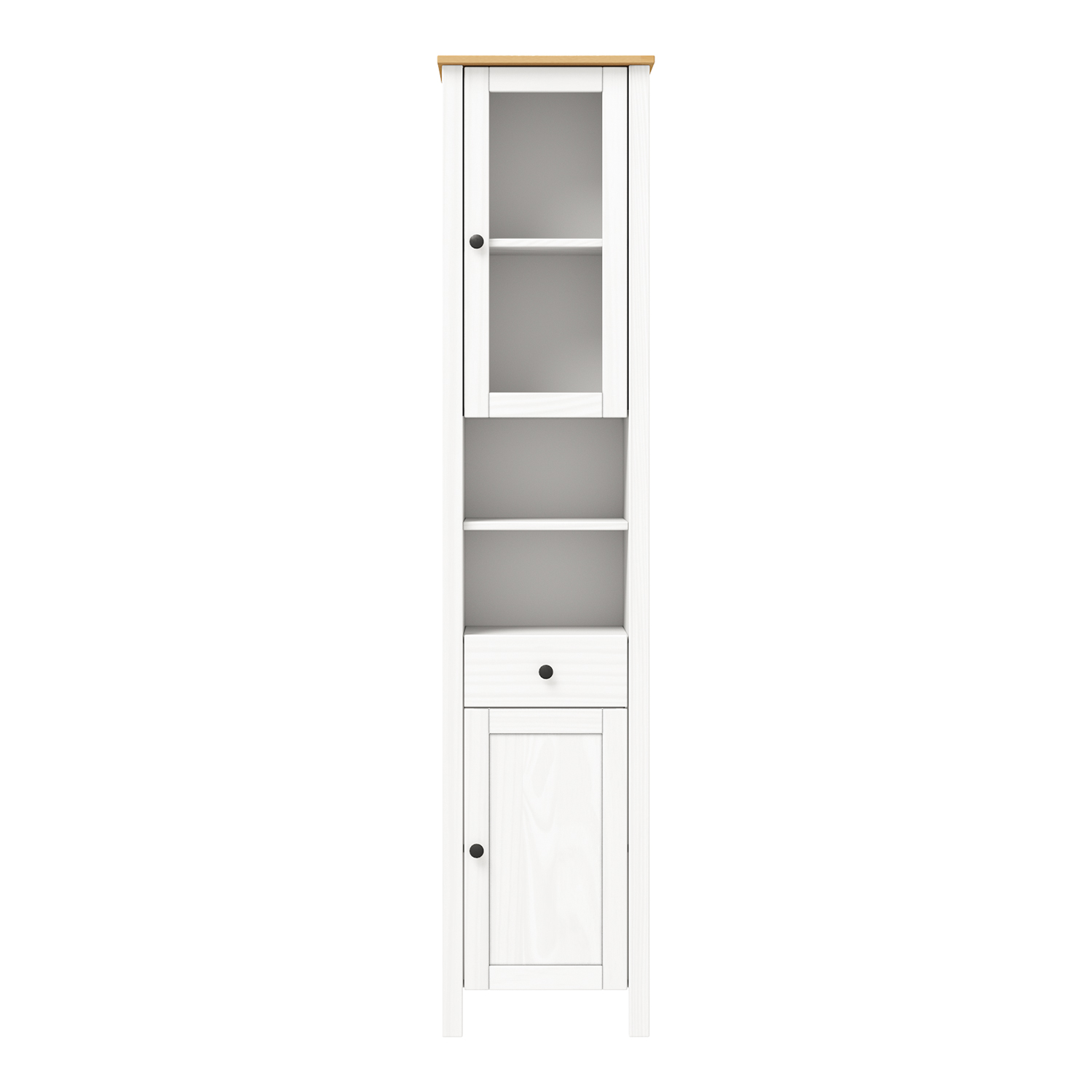 materiál masiv borovice, barevné provedení bílá / buk 1 prosklená a 1 plná dvířka, za každými 1 police 2 niky, 1 zásuvka s kovovými pojezdy maximální nosnosti uvedeny v návodu k montáži součást sestavy PORTO bílá / buk