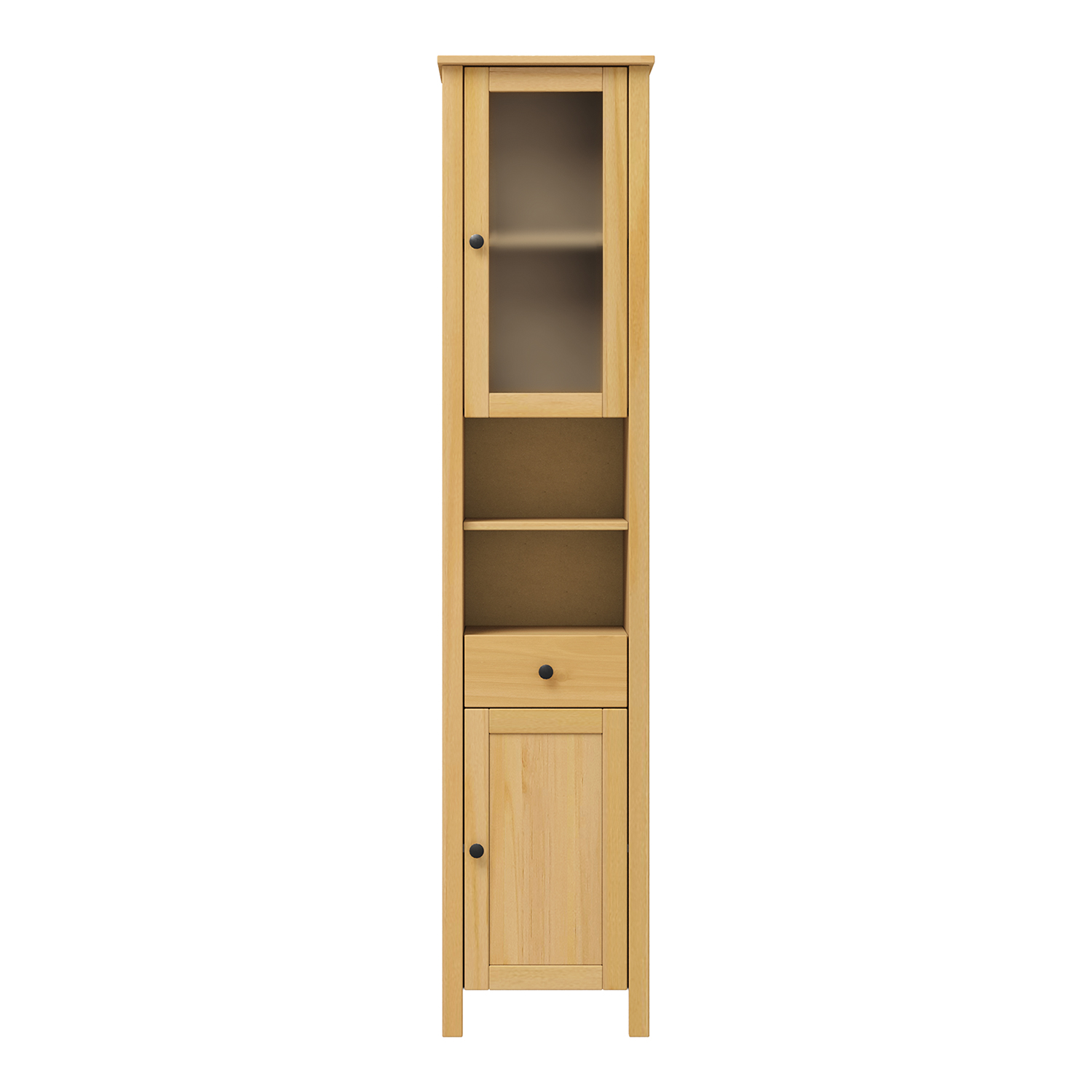materiál masiv borovice, barevné provedení buk 1 prosklená a 1 plná dvířka, za každými 1 police 2 niky, 1 zásuvka s kovovými pojezdy maximální nosnosti uvedeny v návodu k montáži součást sestavy PORTO buk