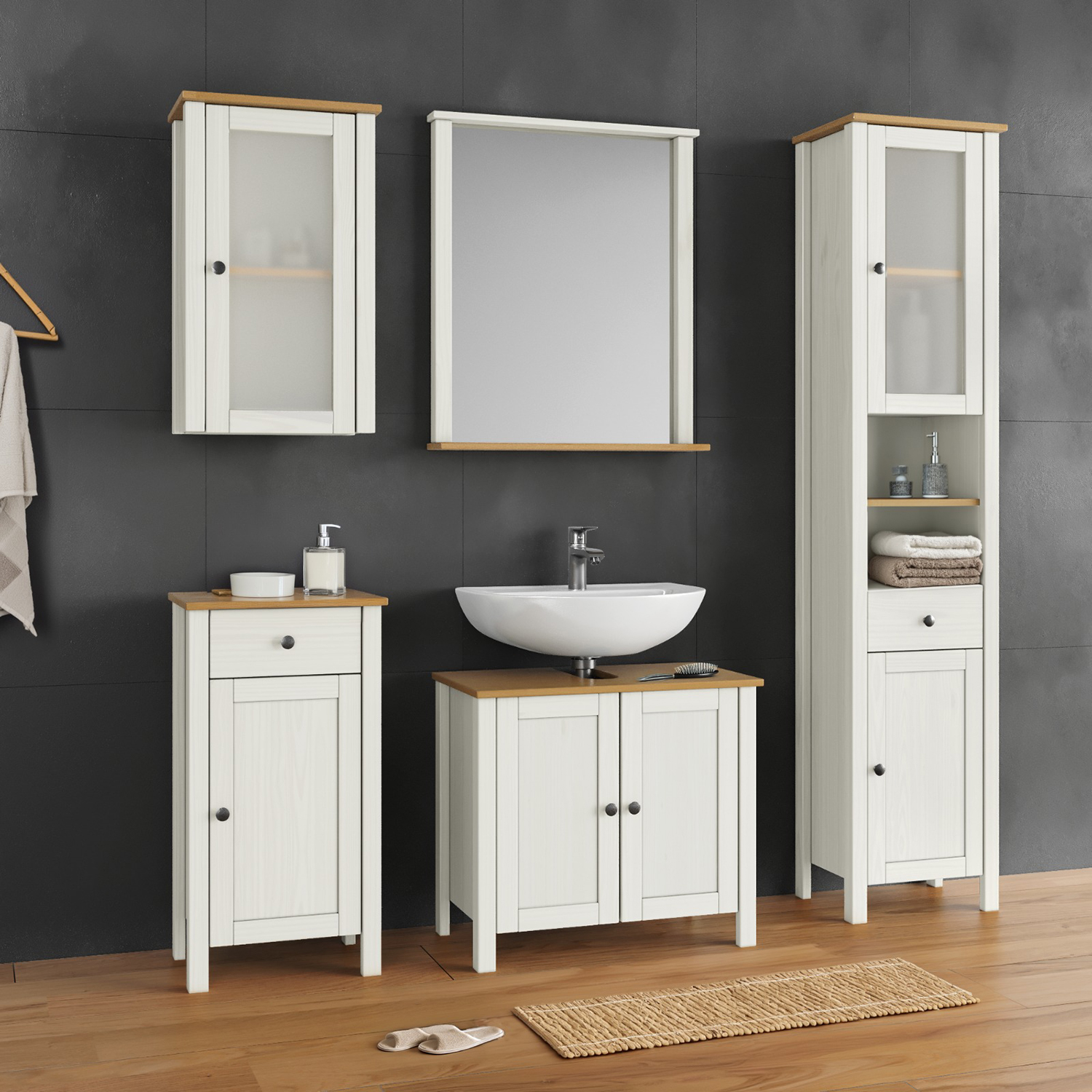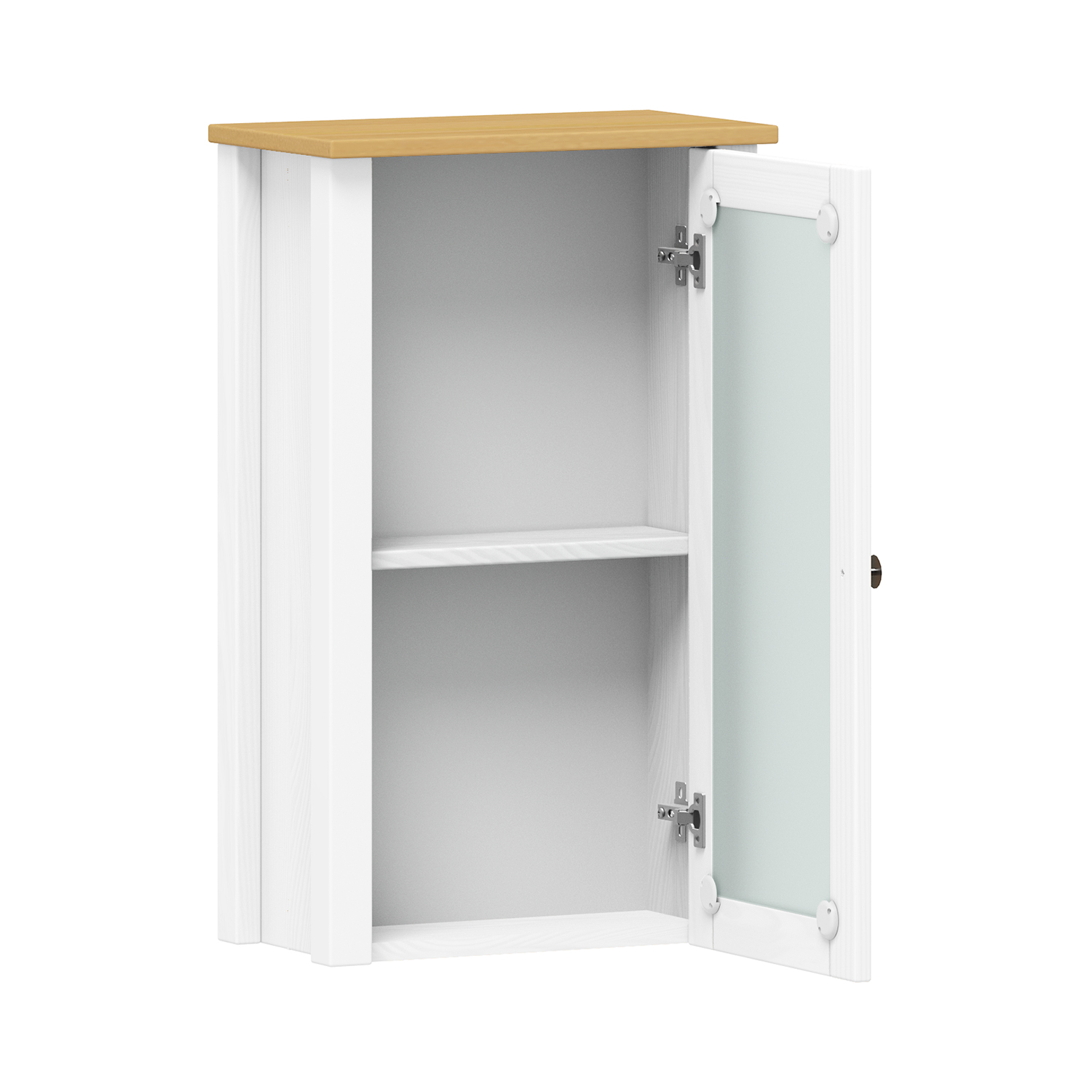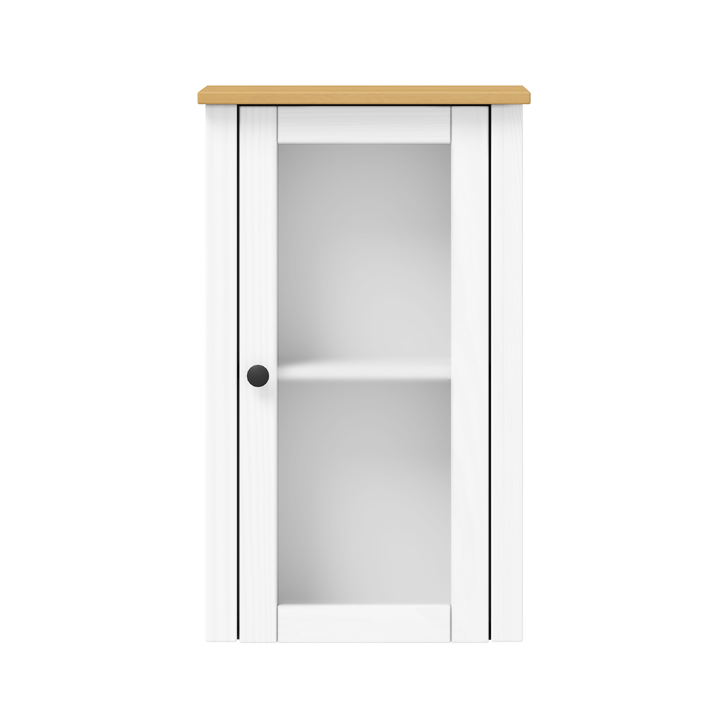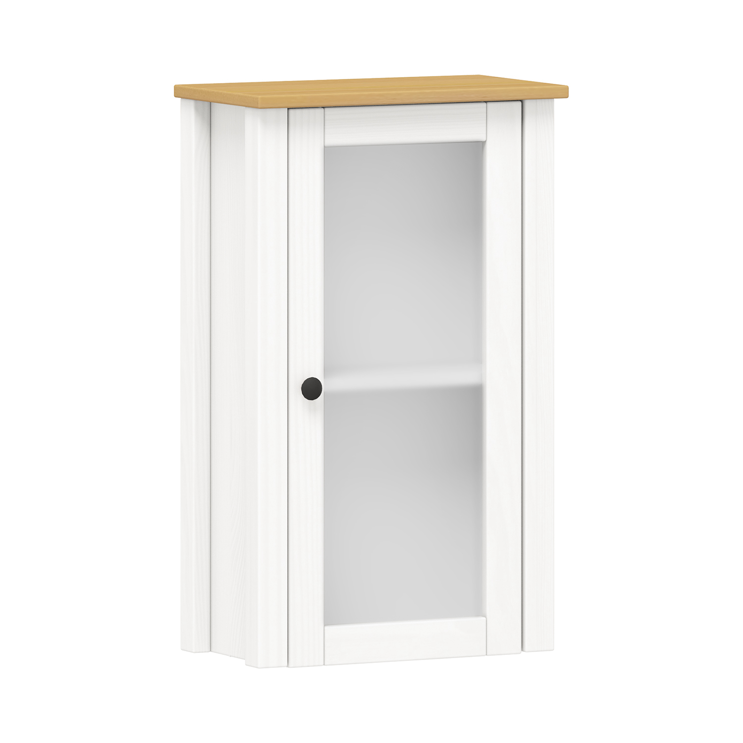 materiál masiv borovice, barevné provedení bílá / buk jedna prosklená dvířka, za nimi jedna police maximální nosnosti uvedeny v návodu k montáži součást sestavy PORTO bílá / buk