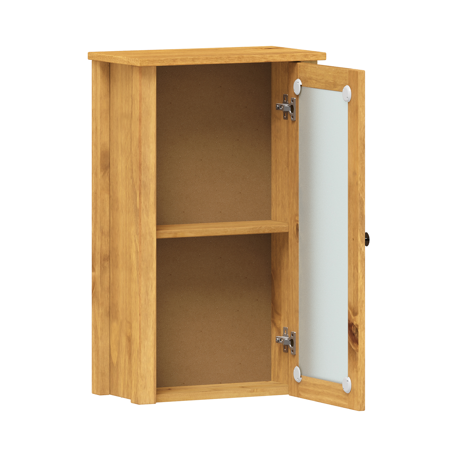 materiál masiv borovice, voskované provedení jedna prosklená dvířka, za nimi jedna police maximální nosnosti uvedeny v návodu k montáži součást sestavy PORTO vosk